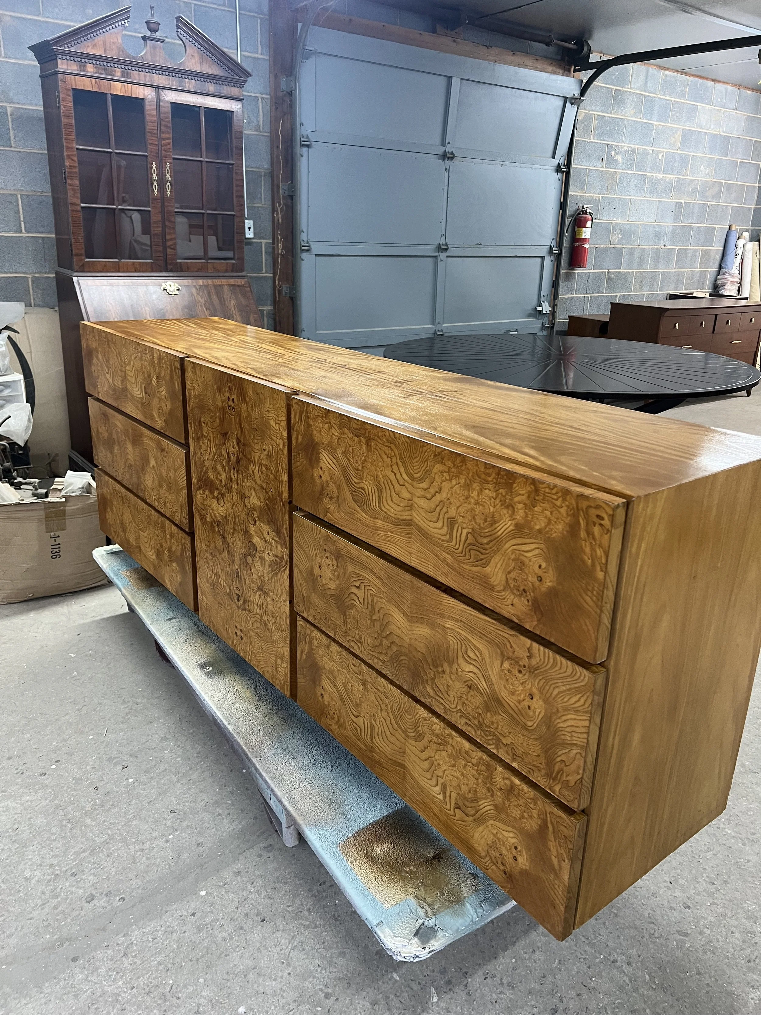 The Lane Alpha triple dresser finally has a backboard and a new solid wood bose. Its finish will hopefully be done soon. I dropped off the Selig Eames-style lounge chair, Milo Baughman for Thayer Coggin lounge chair, and the Drexel Declaration lounge chair and ottoman to upholstery. Those will hopefully be available soon!