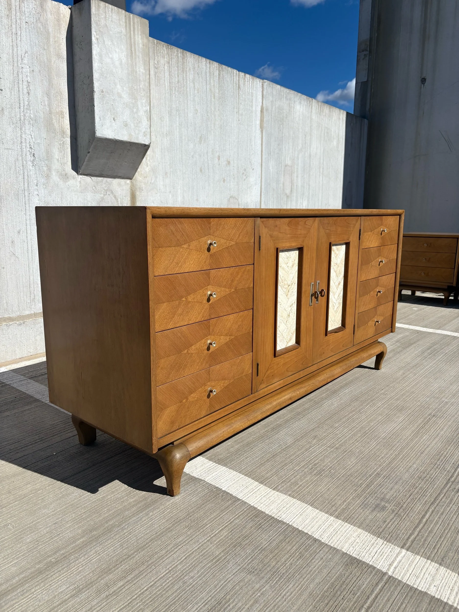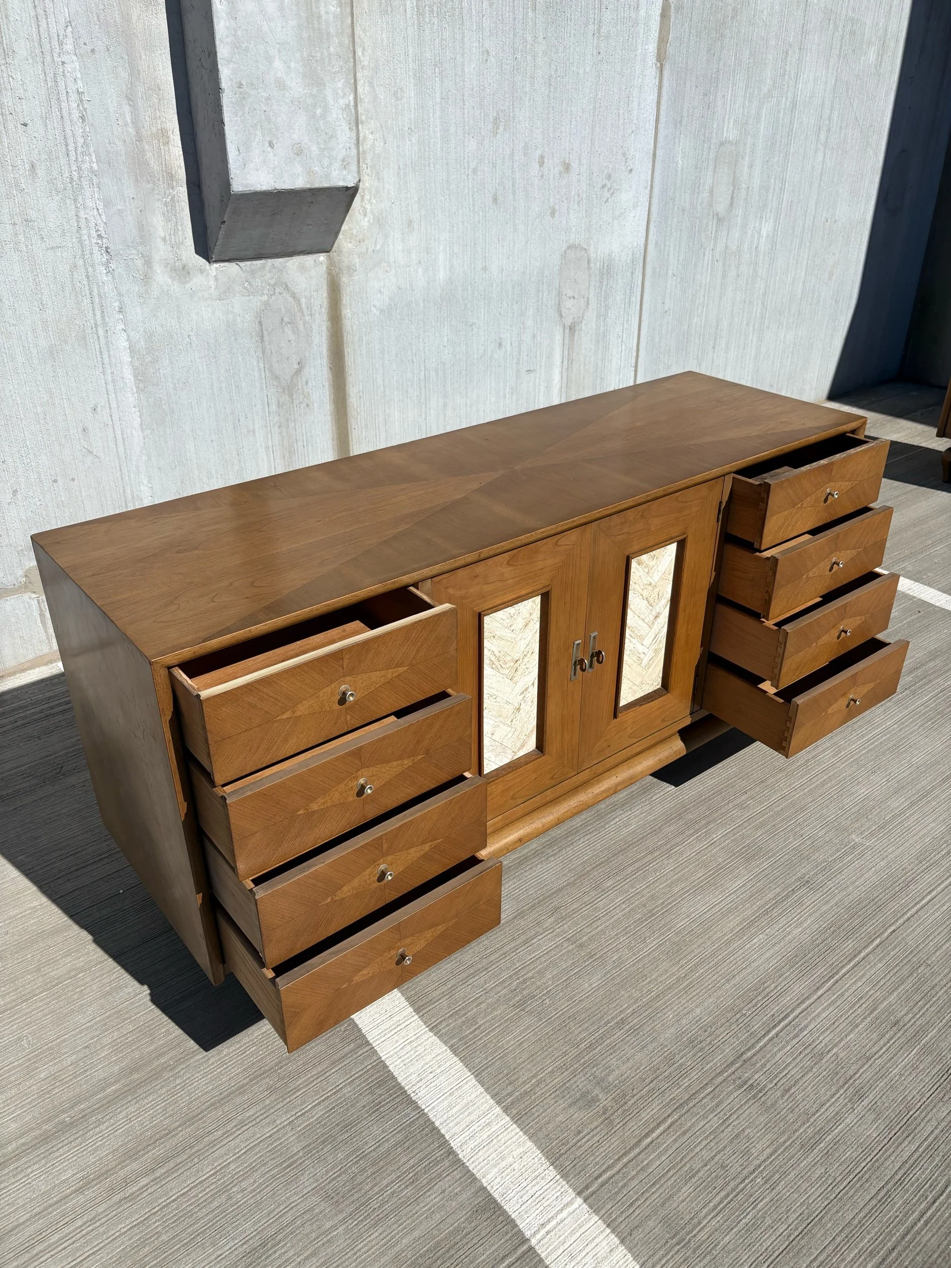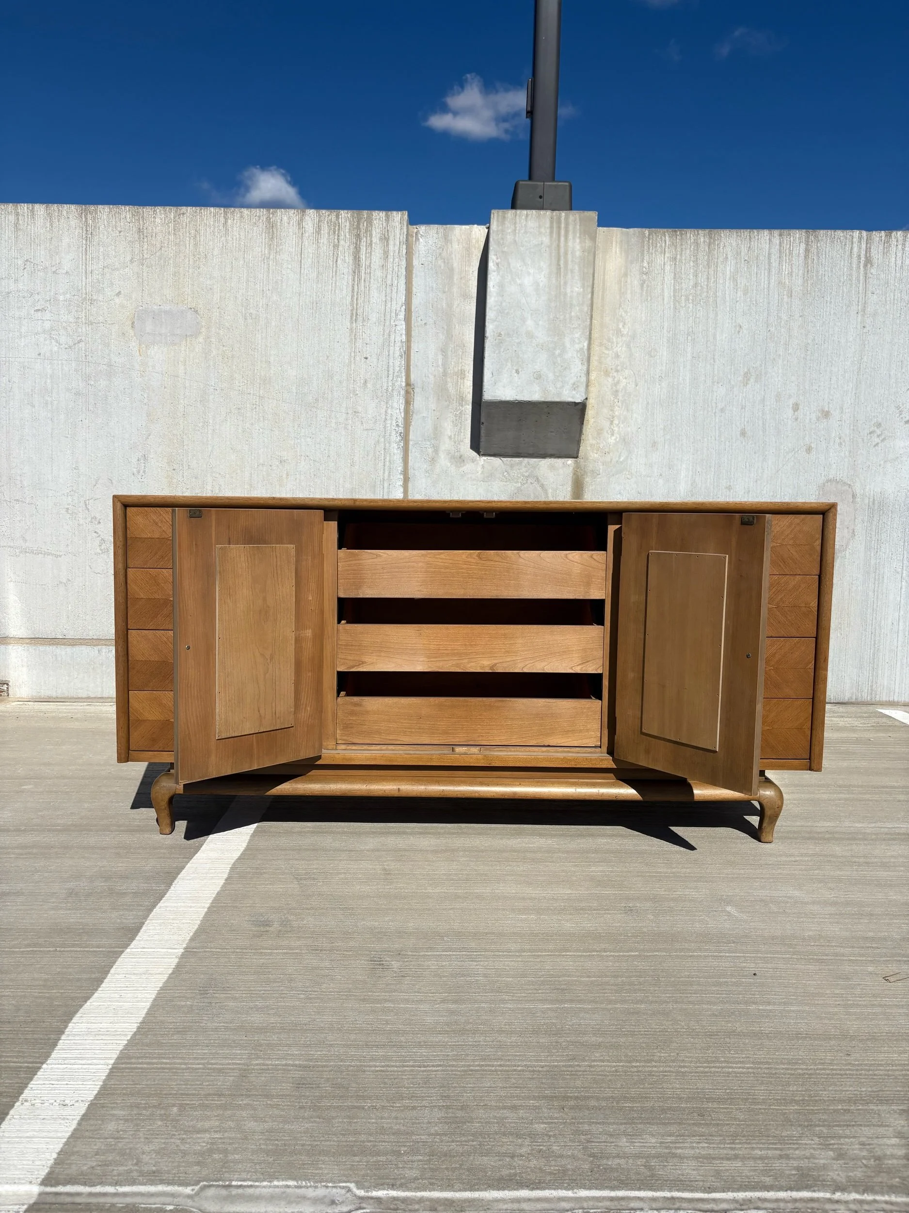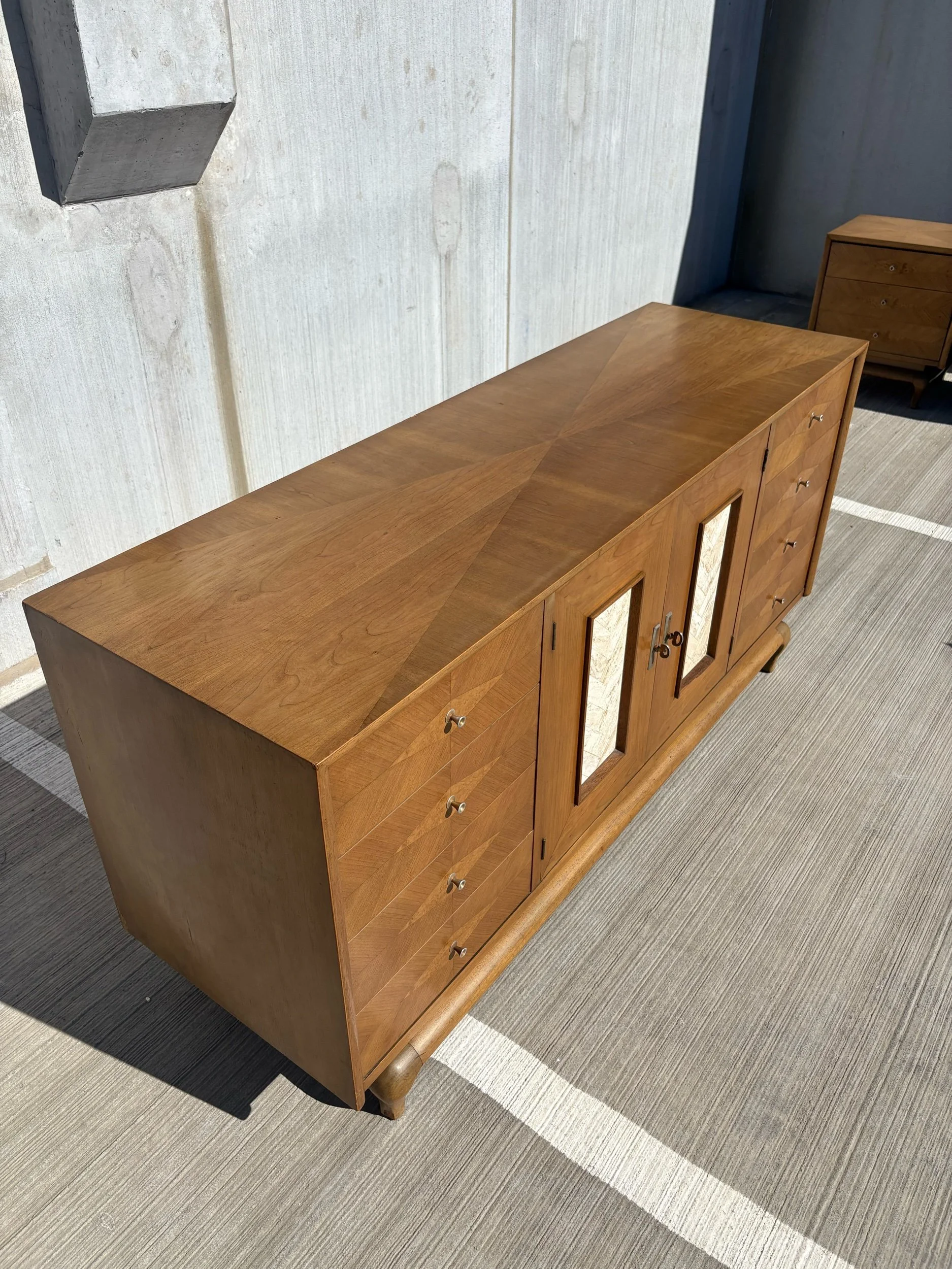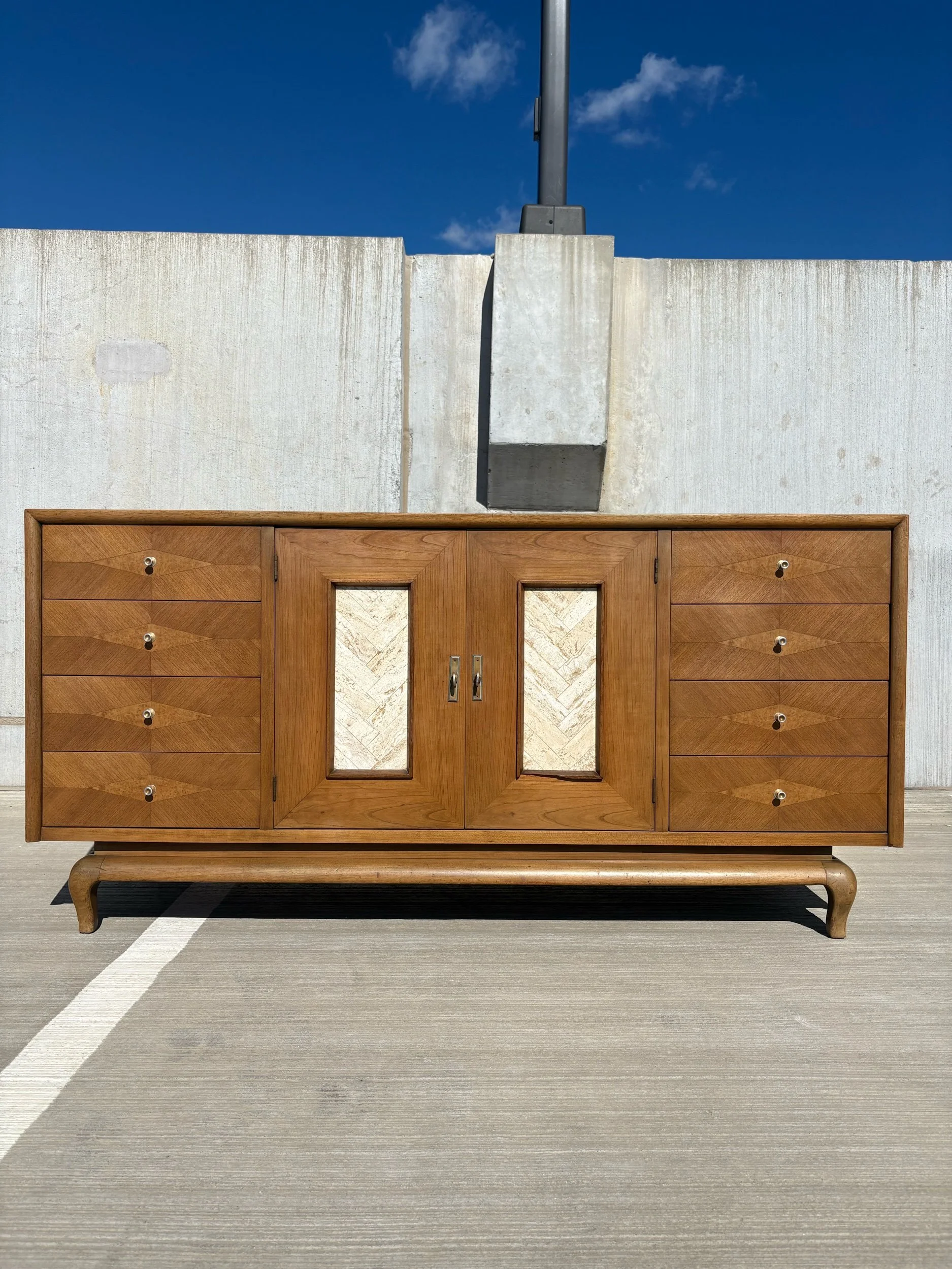 Finish is in great condition with little fading. Veneer is in mostly good contion with a few minor chips that are not very noticeable. All travertine on the front-facing doors is in great shape with no cracks. There is some damage on the bottom of the right side door around the travertine’s casing. This is repairable by the right professional and not something that makes this deserving of a life in a landfill.