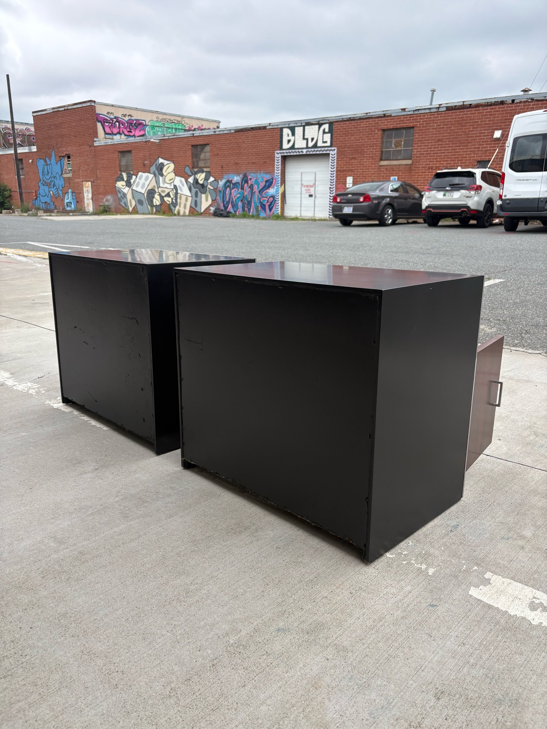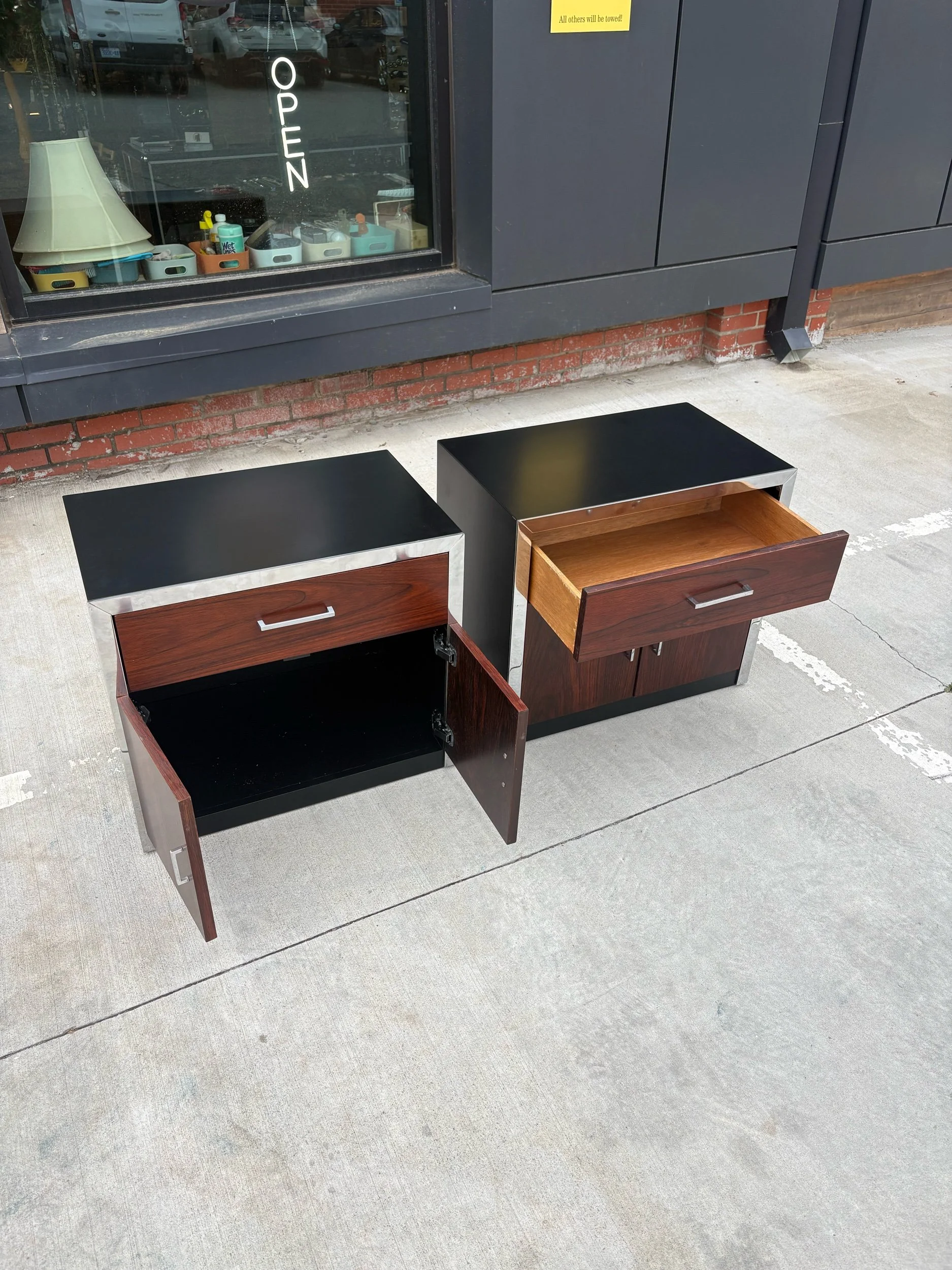 These nightstands feature a beautiful rosewood front with chrome accents along the face, and polished chrome hardware. The casing has been restored with a thick layer of black lacquer to cover imperfections on the original black enameled casing. Drawer glides were broken, and have been replaced. Ready for another lifetime of use.