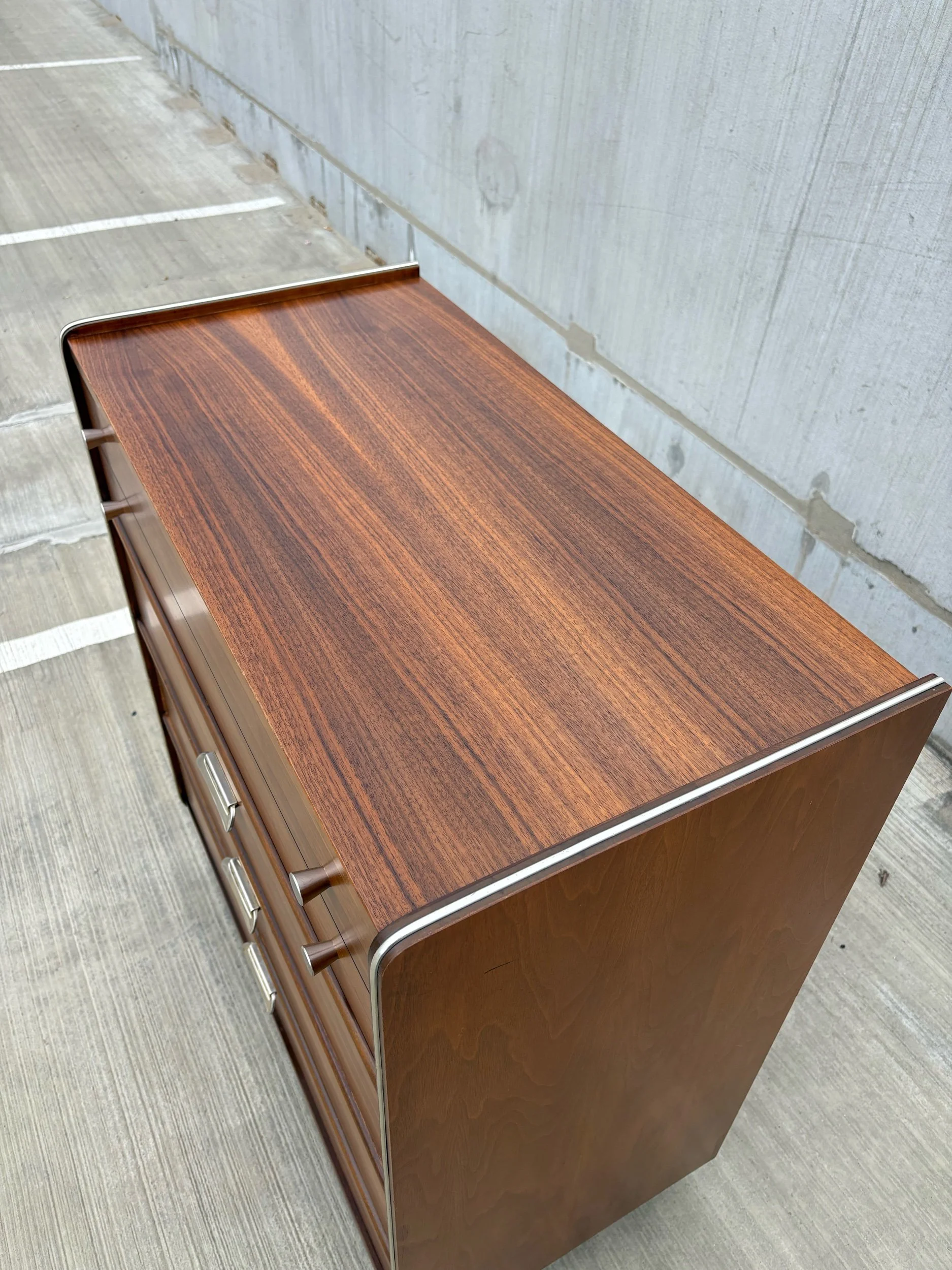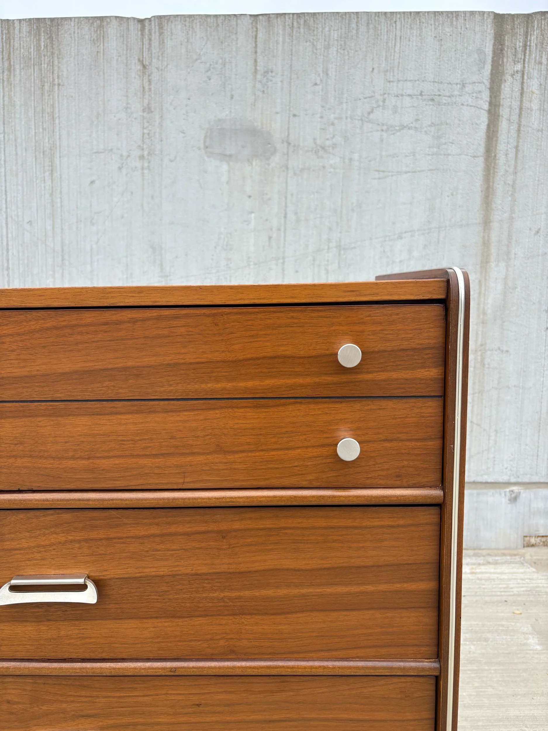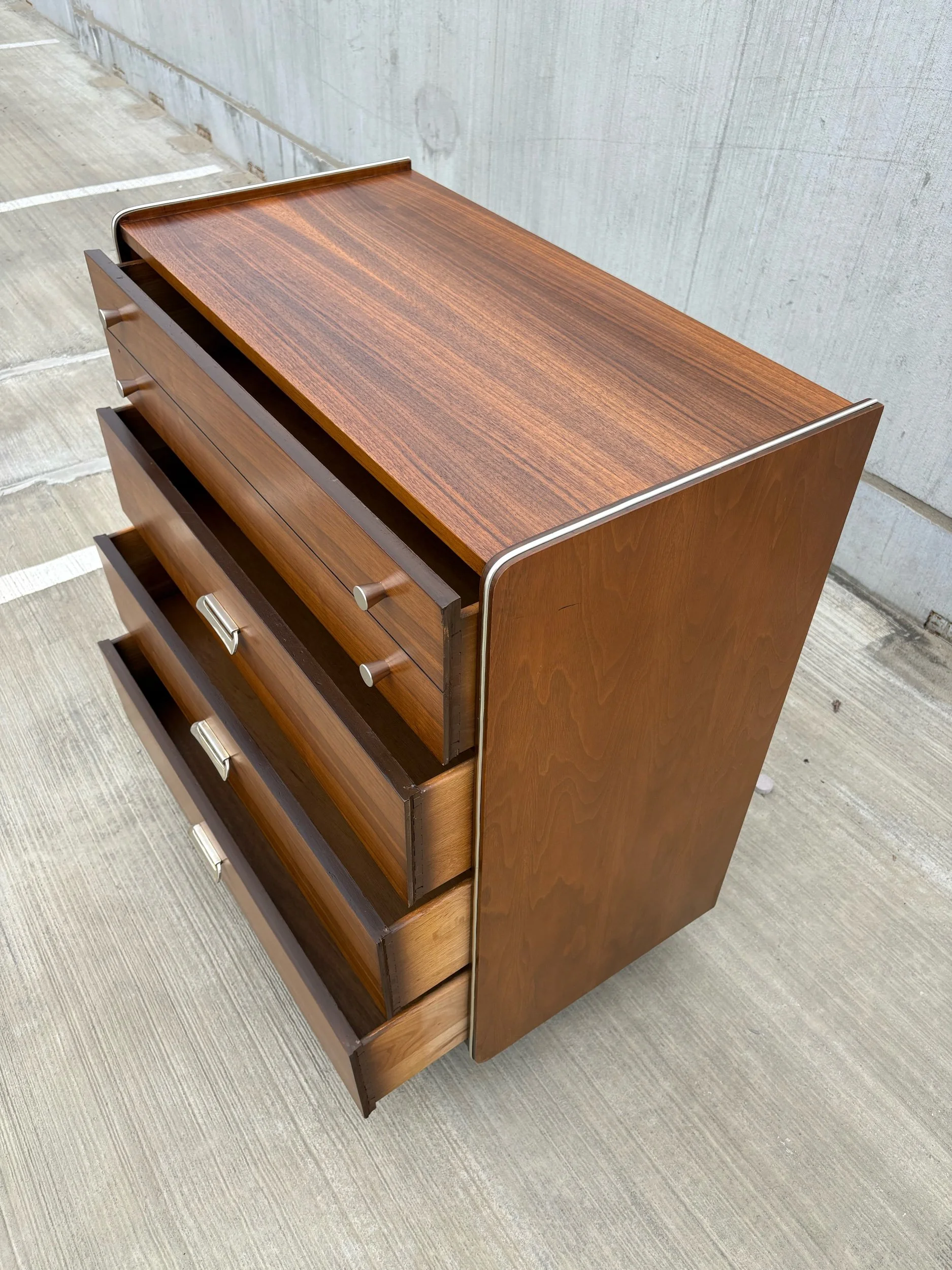 A cute lil walnut dresser with chrome hardware and accents along the casing.