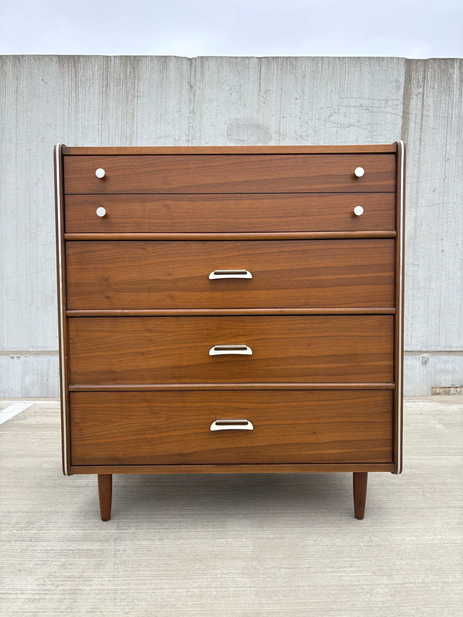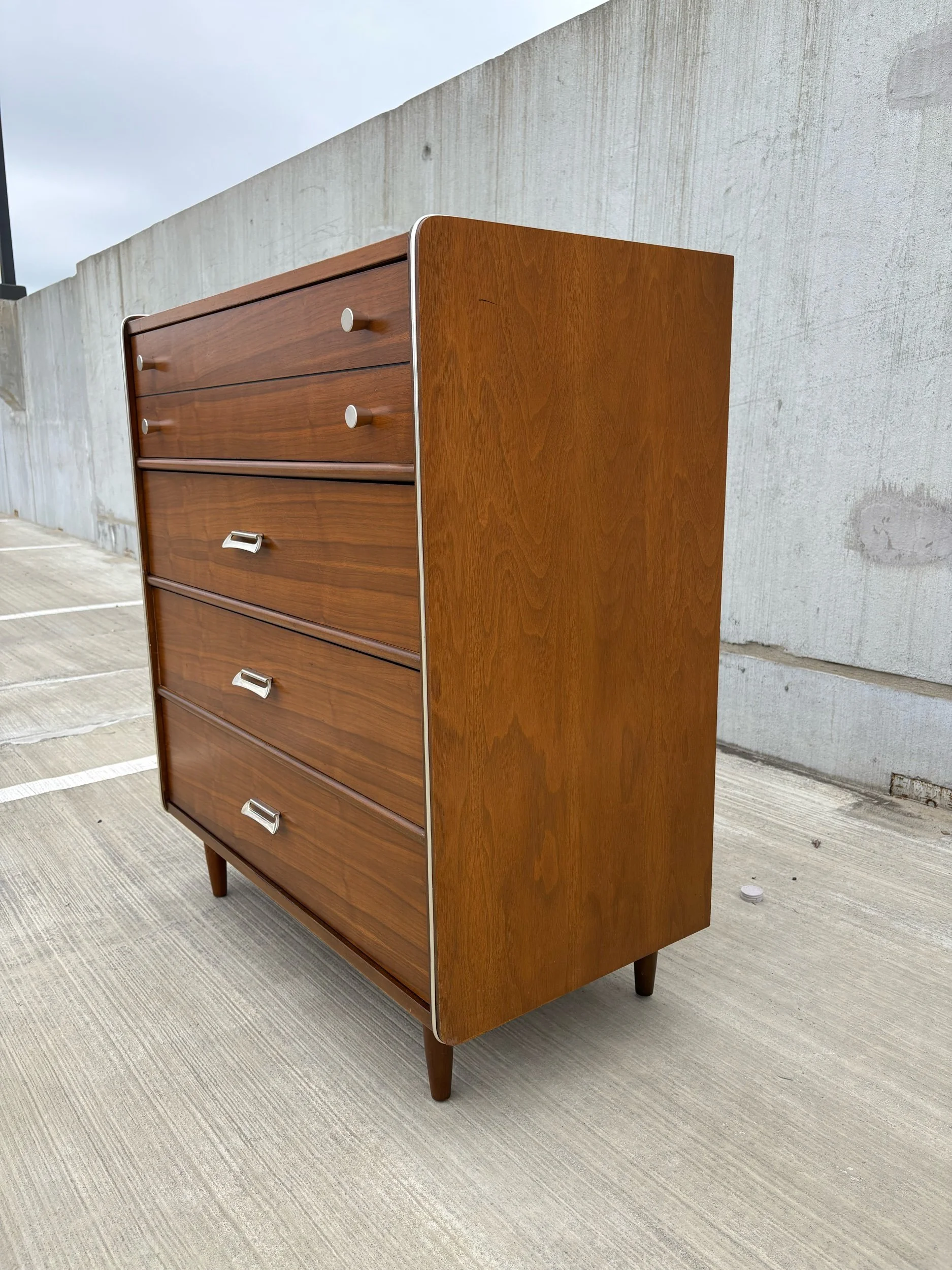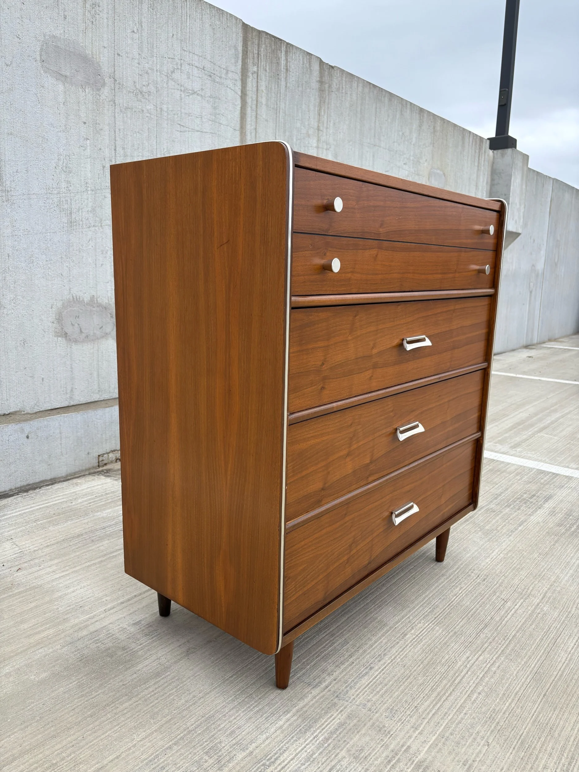 A cute lil walnut dresser with chrome hardware and accents along the casing.