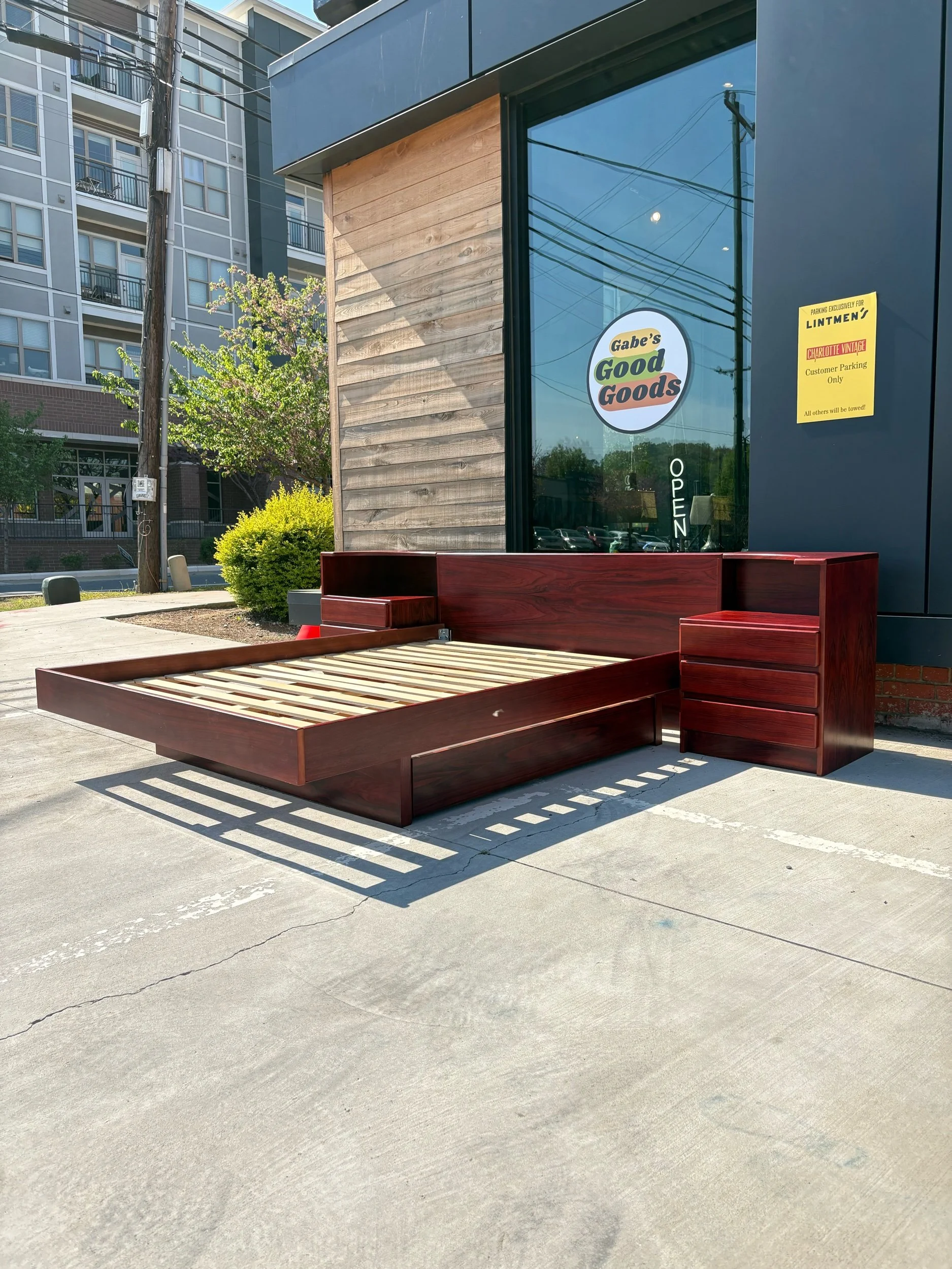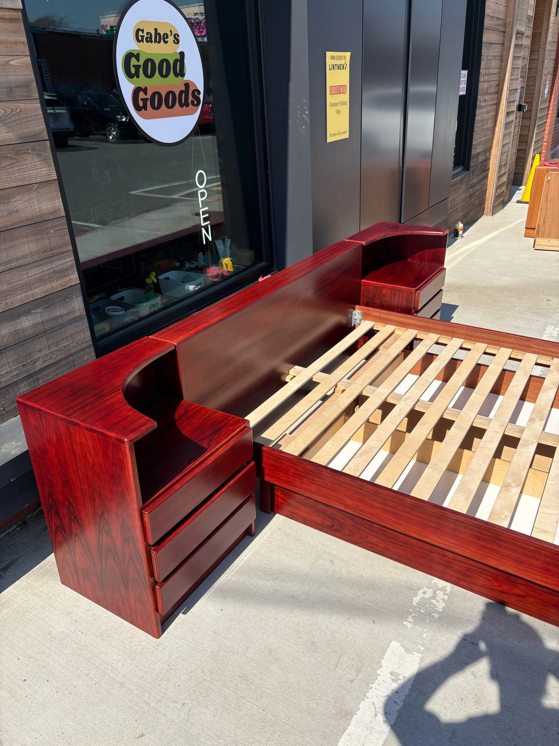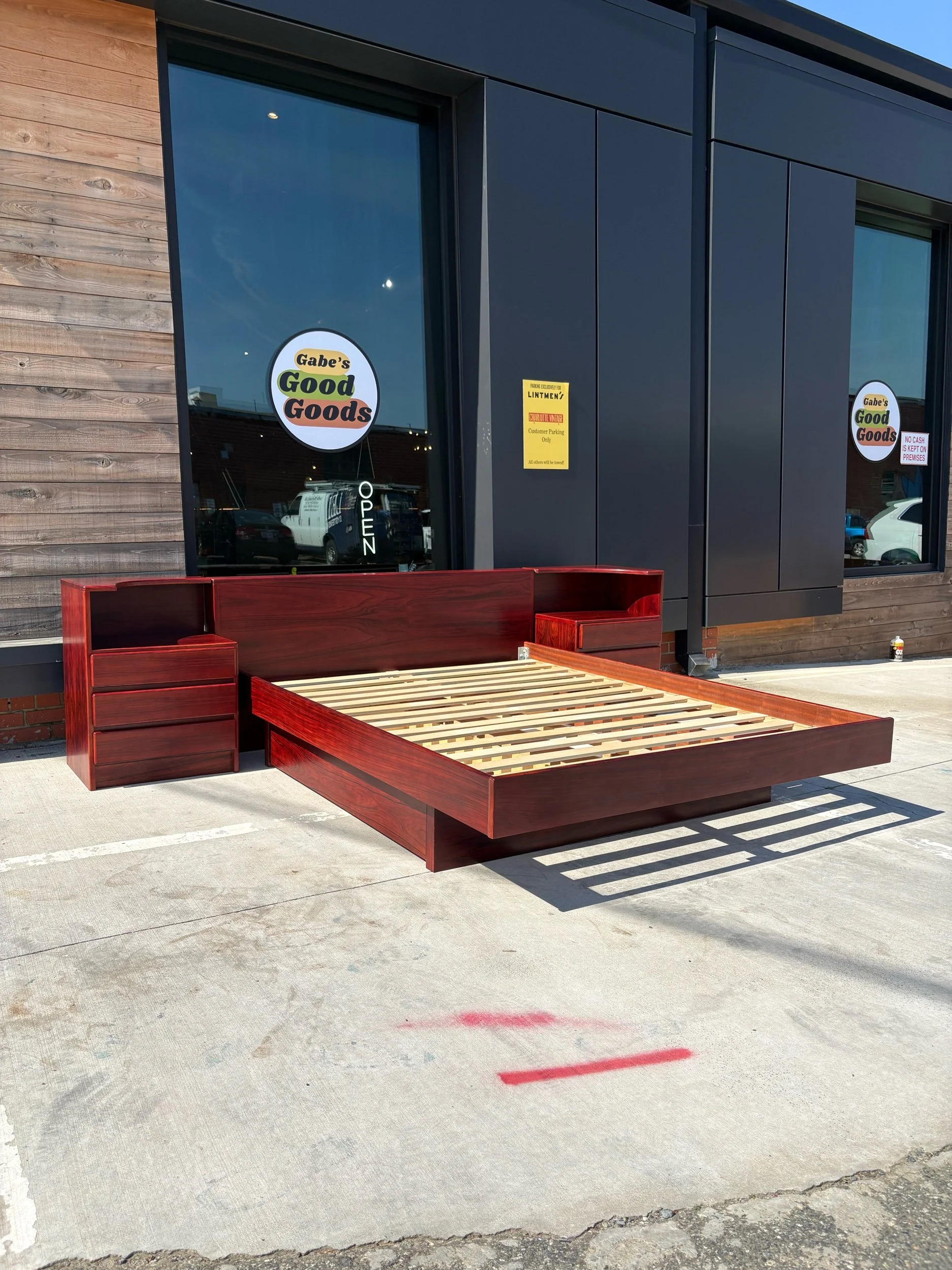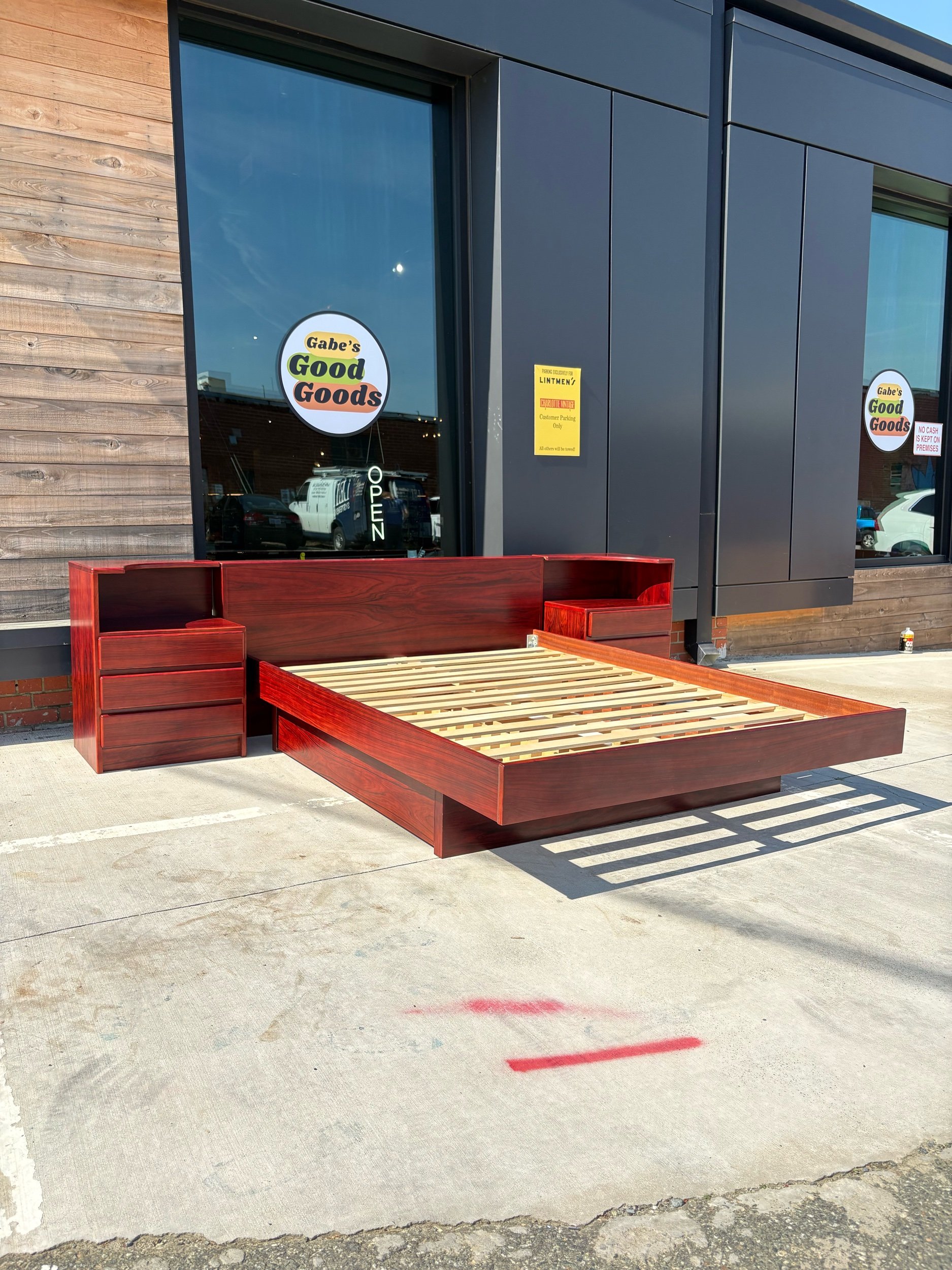A stunning Canadian rosewood queen platform bed with matching nightstands in pristine original condition.