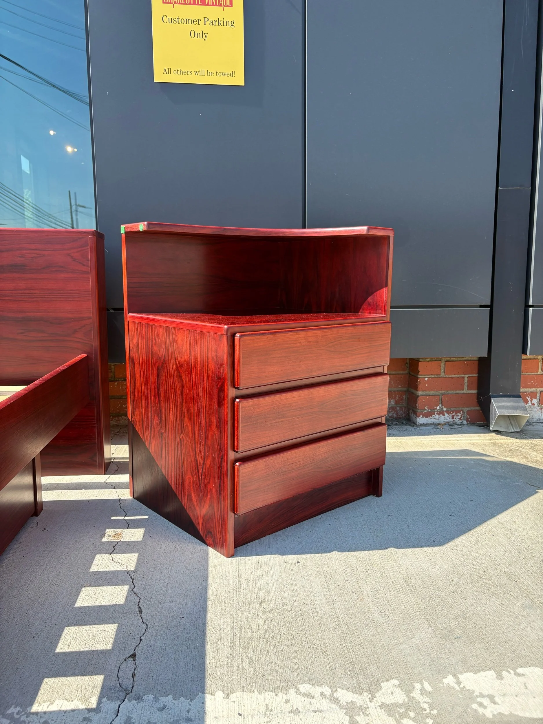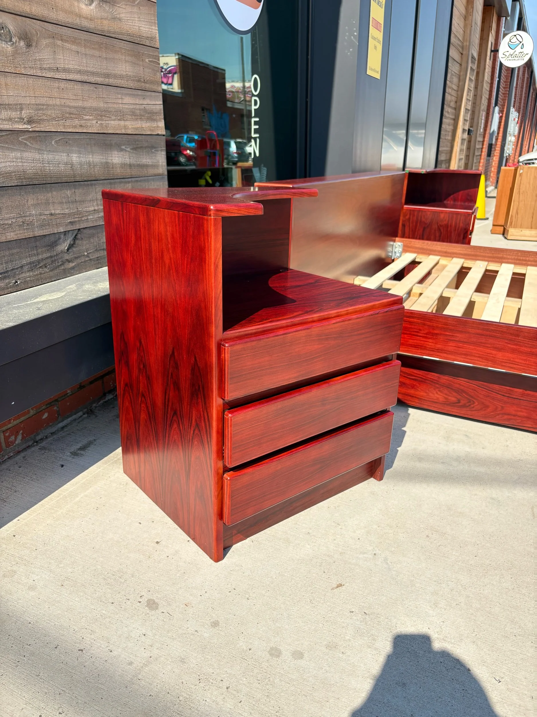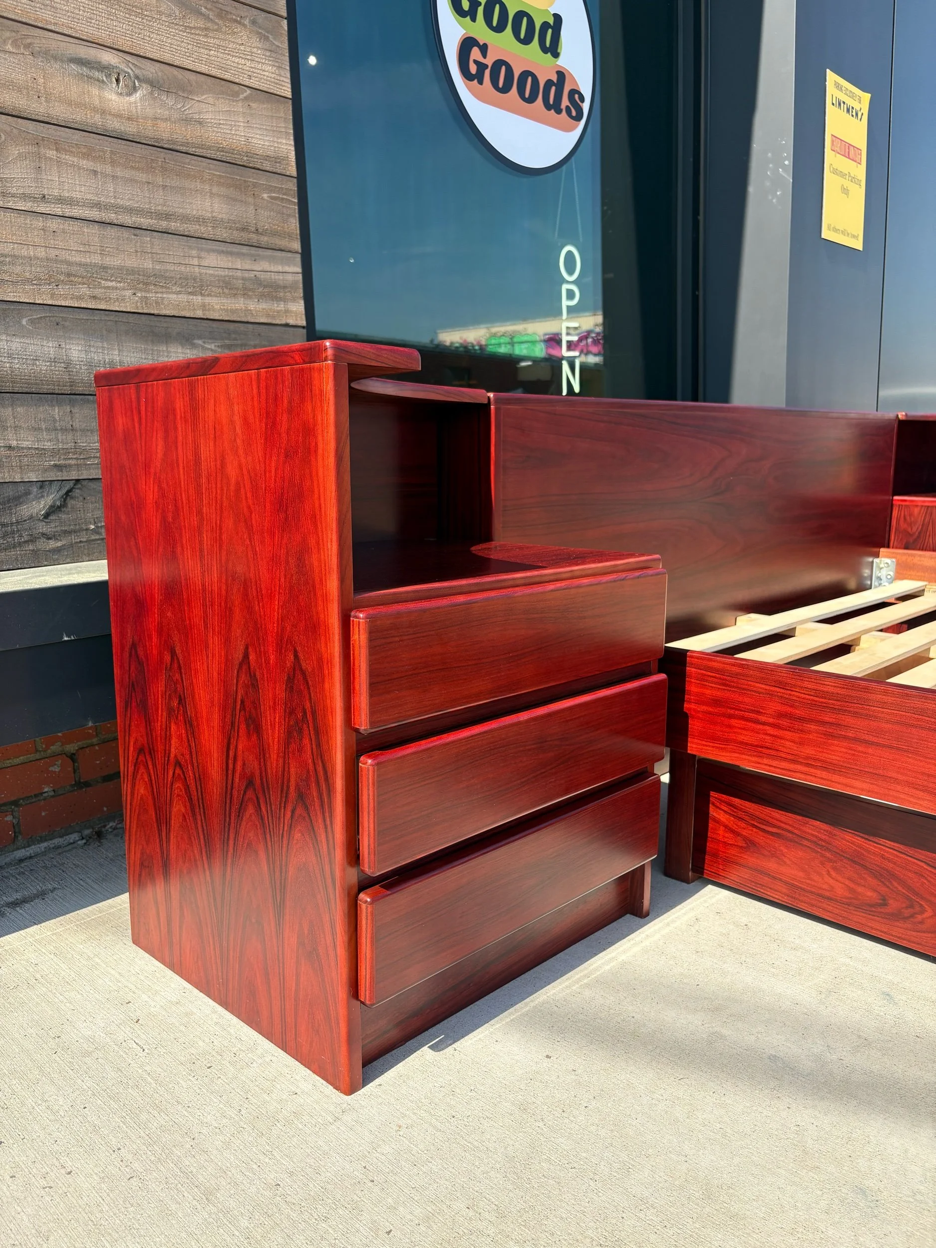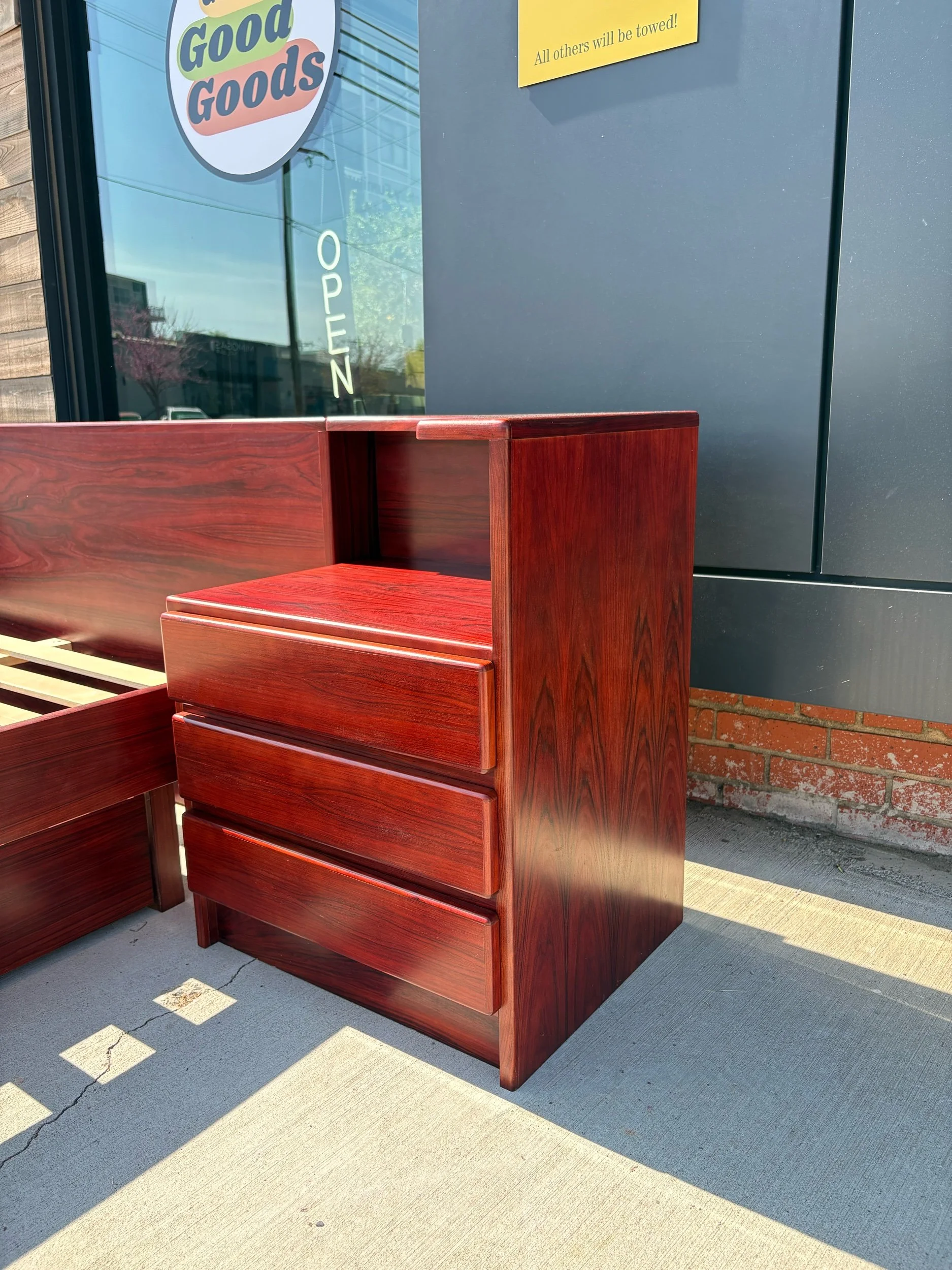 A stunning Canadian rosewood queen platform bed with matching nightstands in pristine original condition.