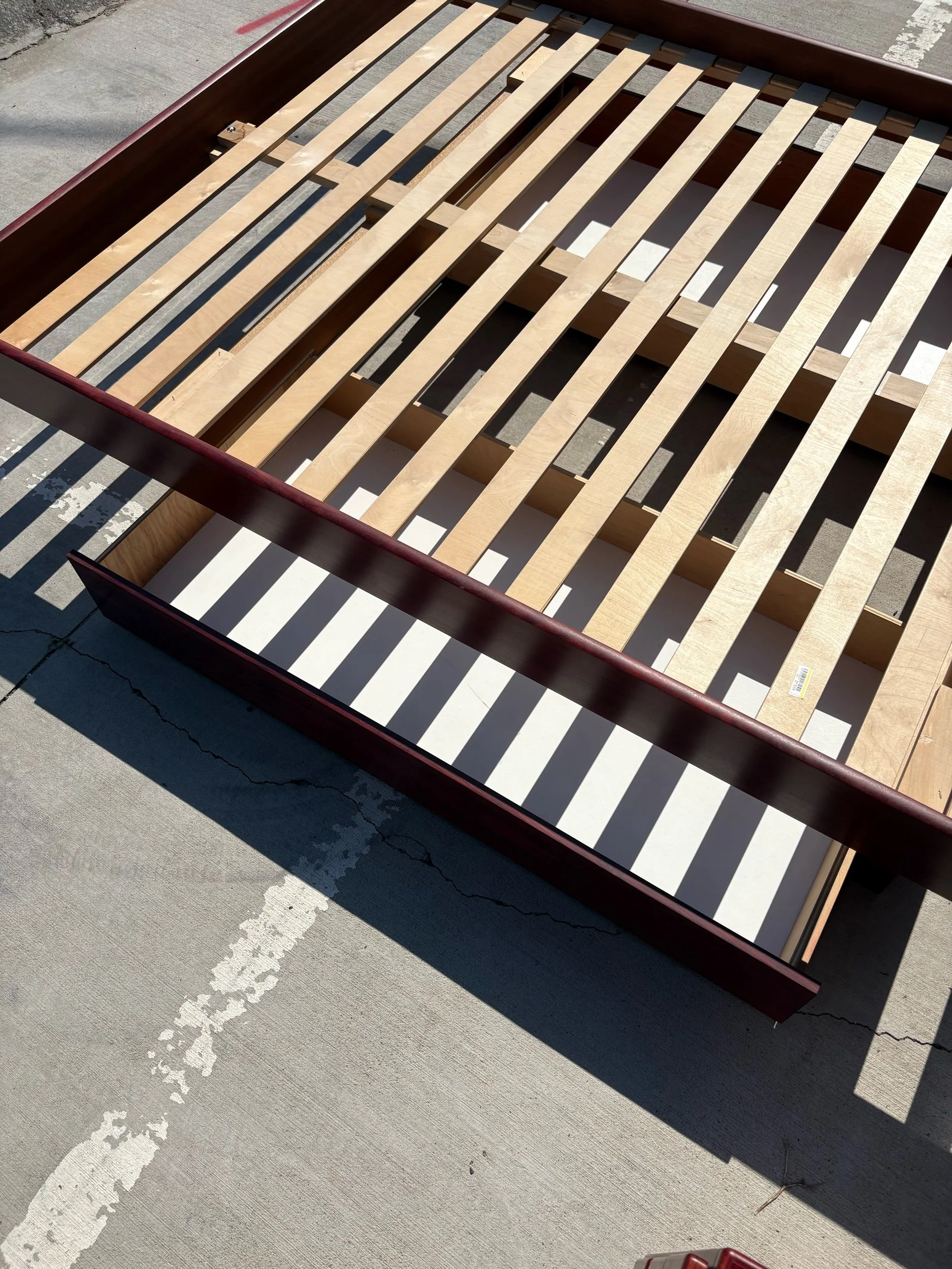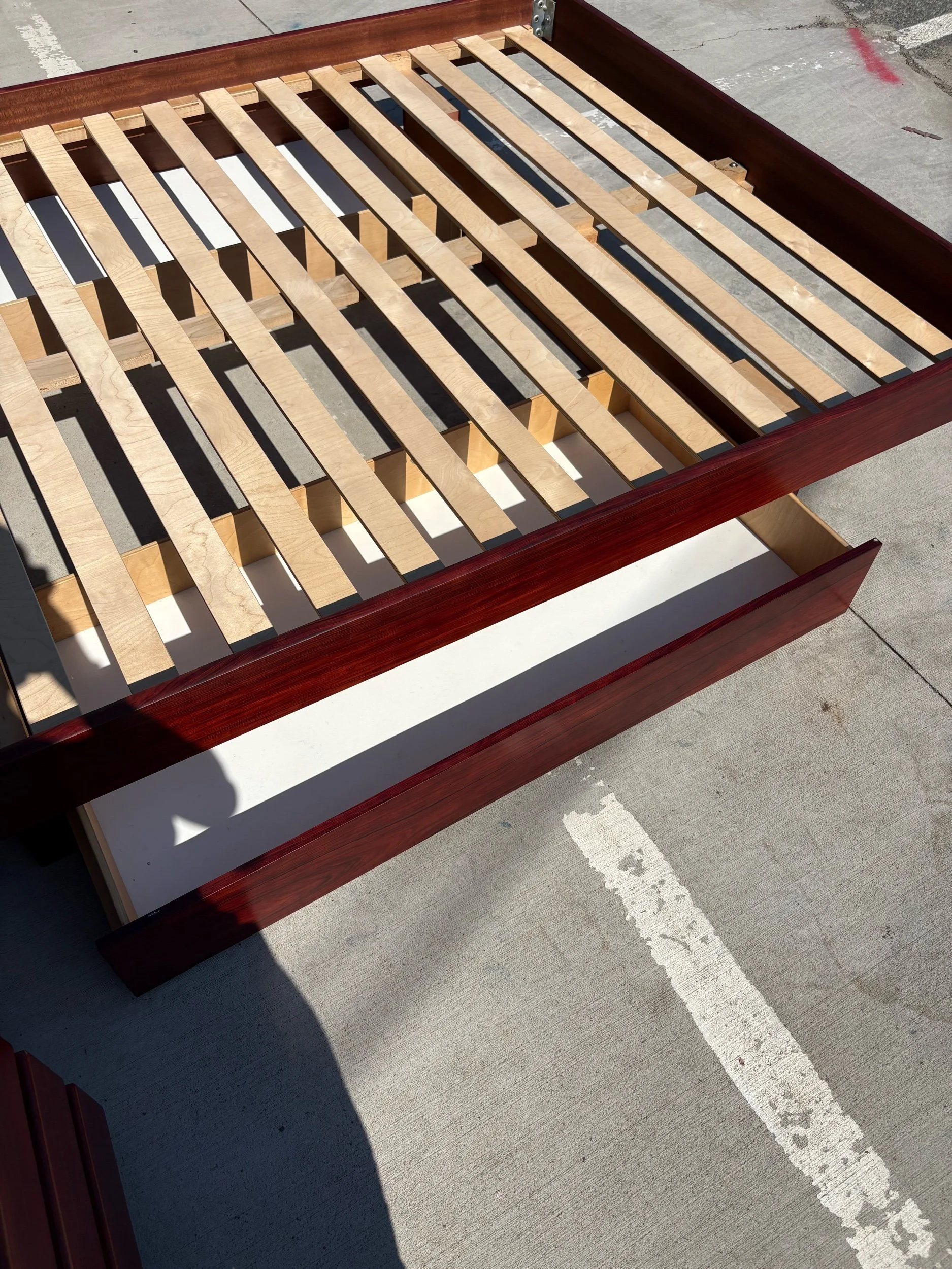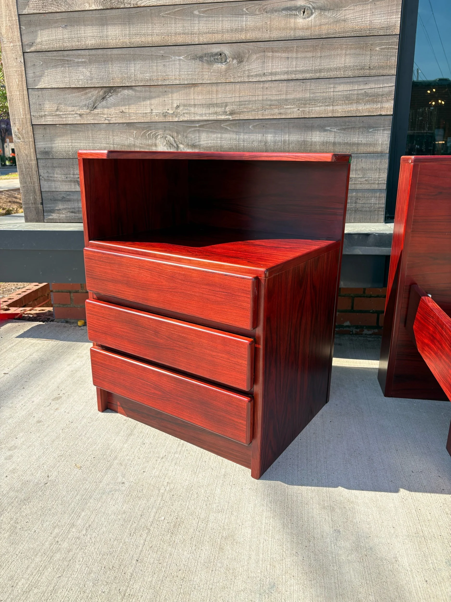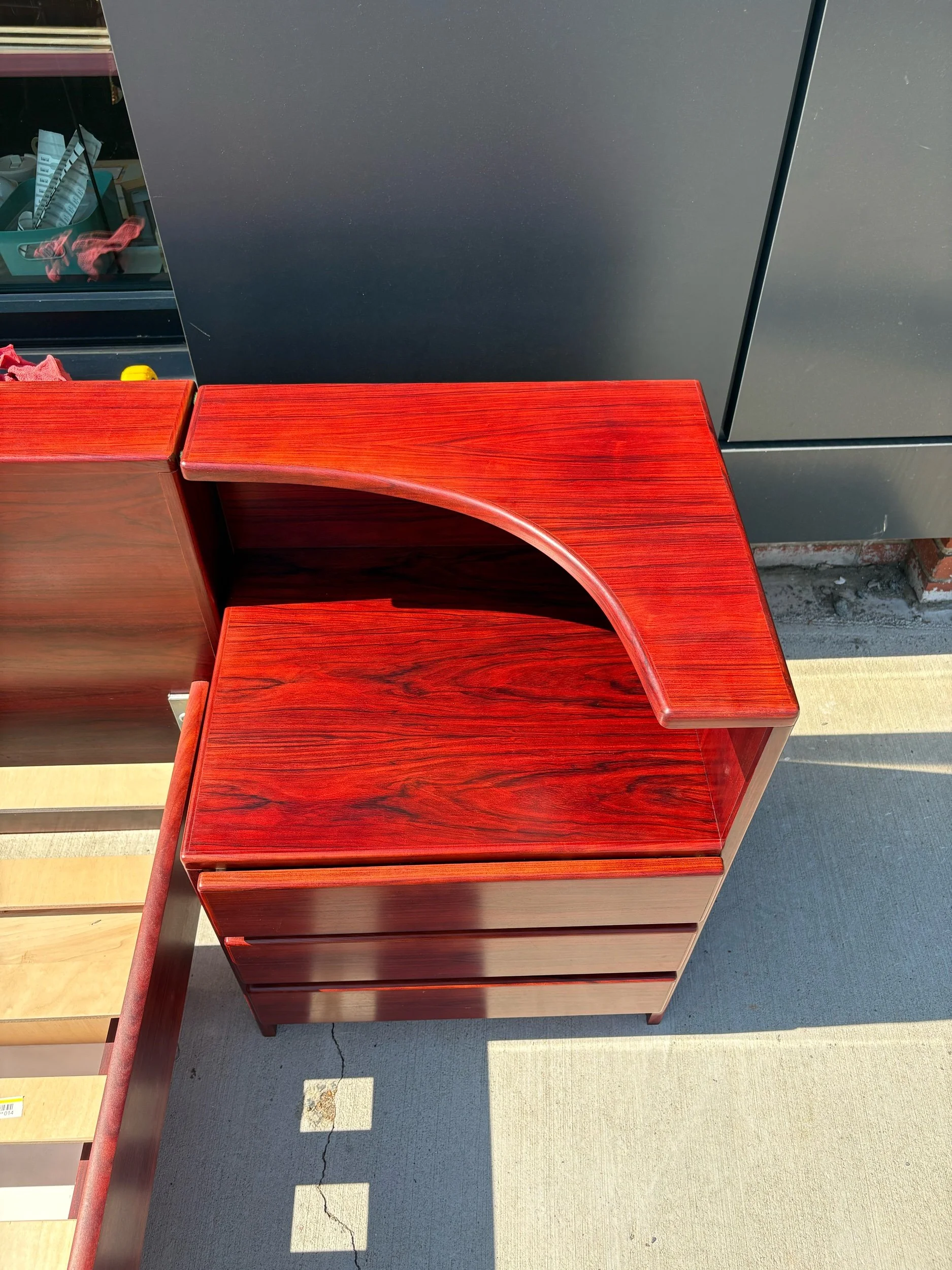 A stunning Canadian rosewood queen platform bed with matching nightstands in pristine original condition.