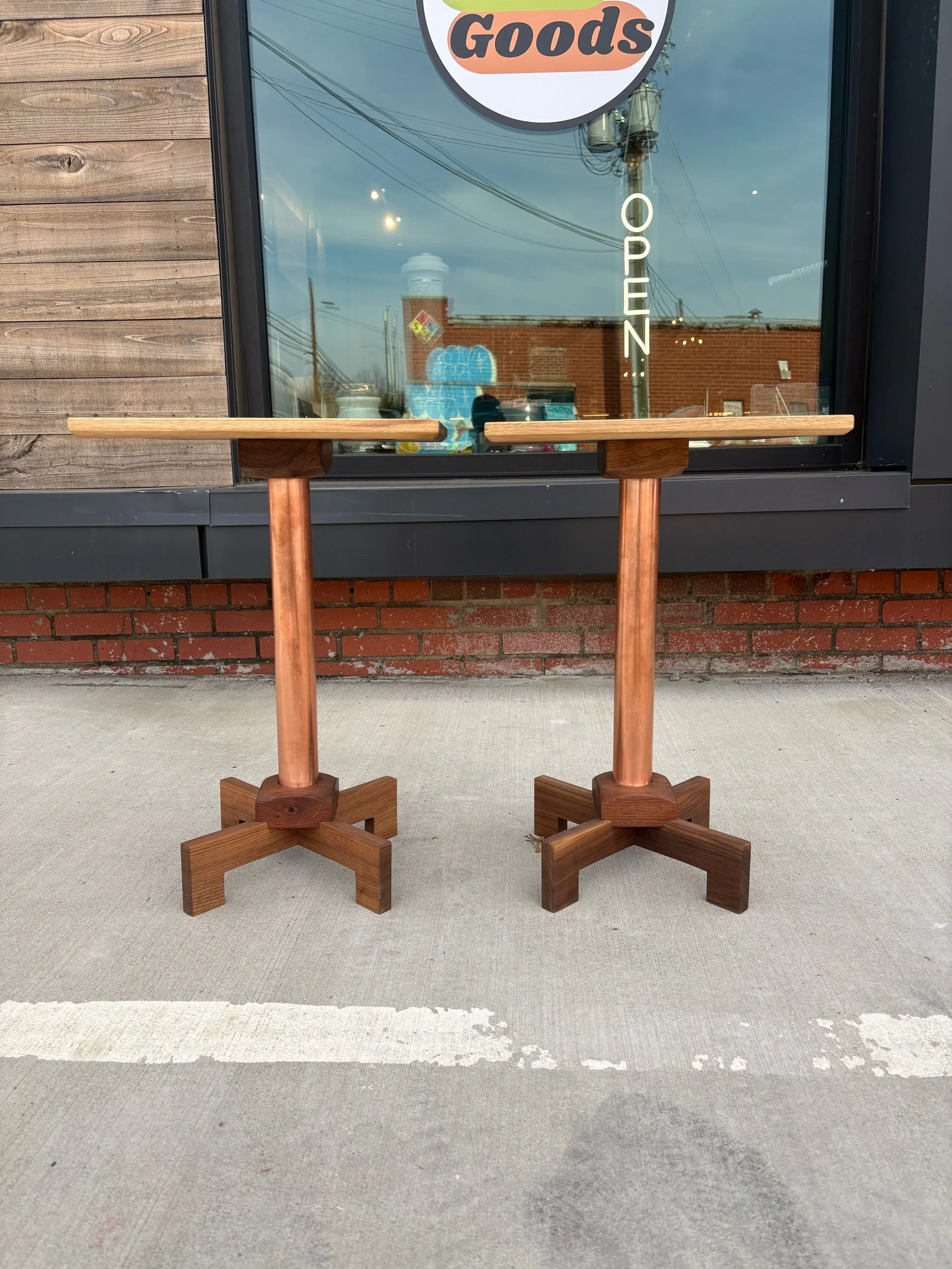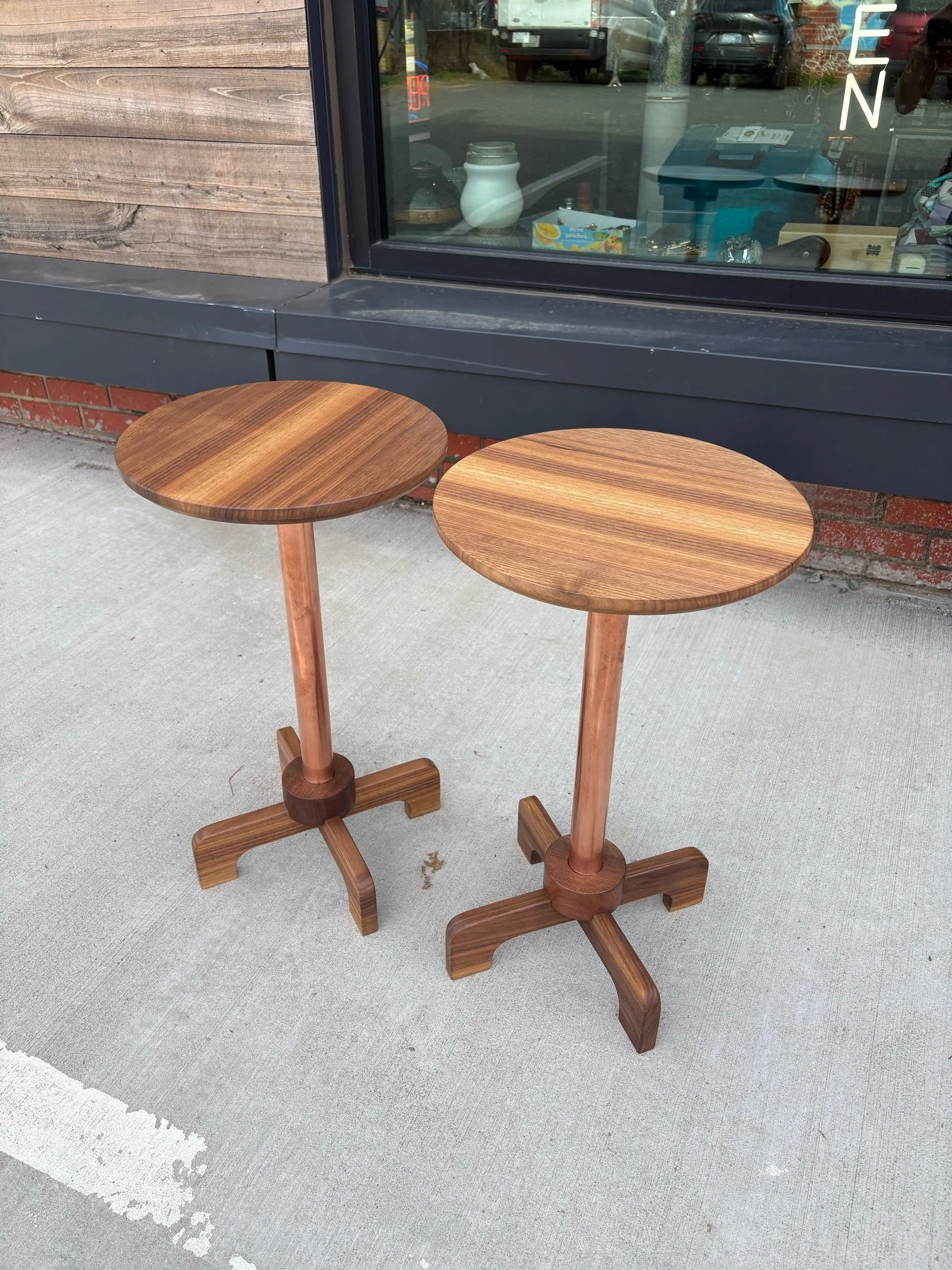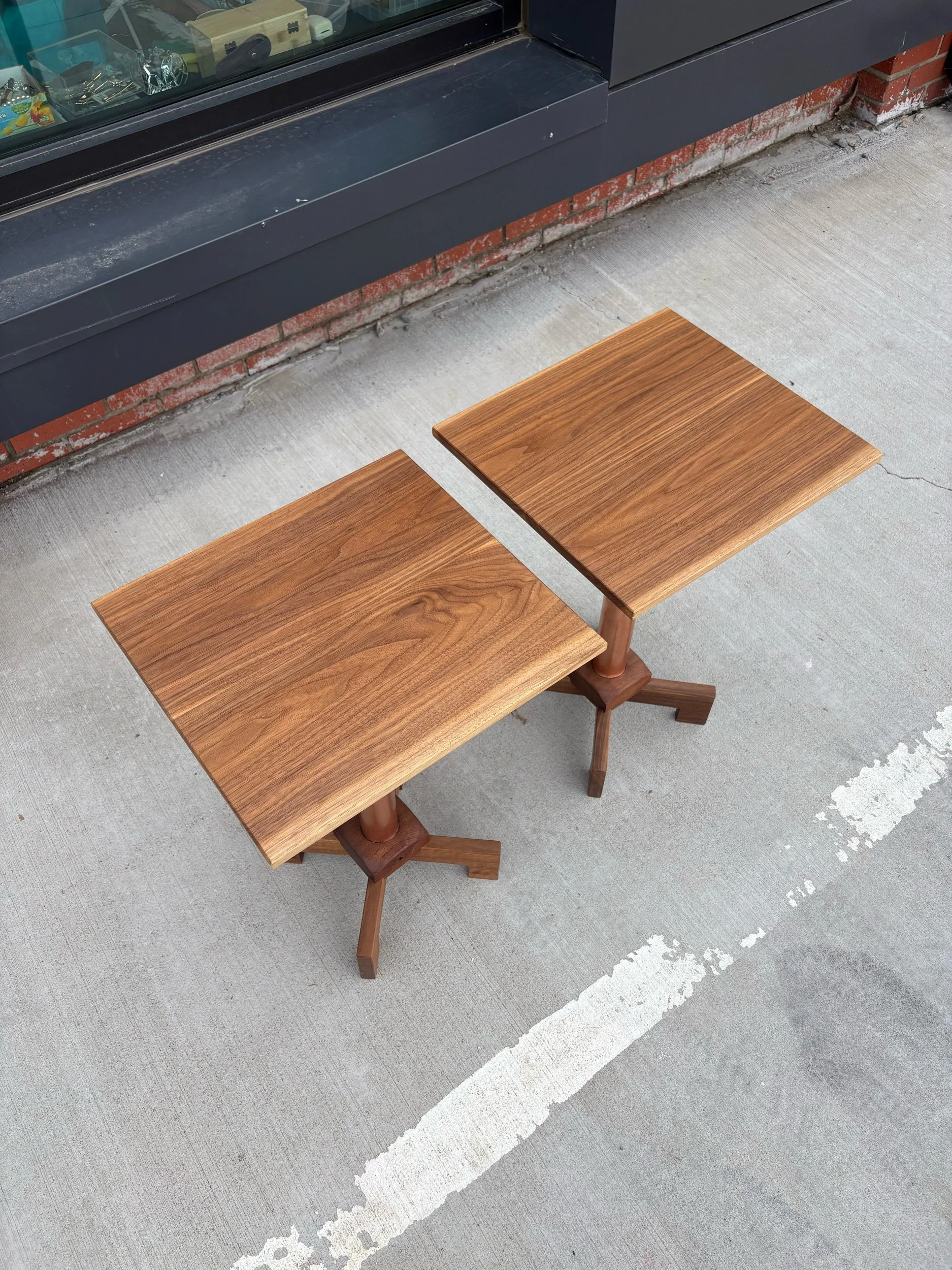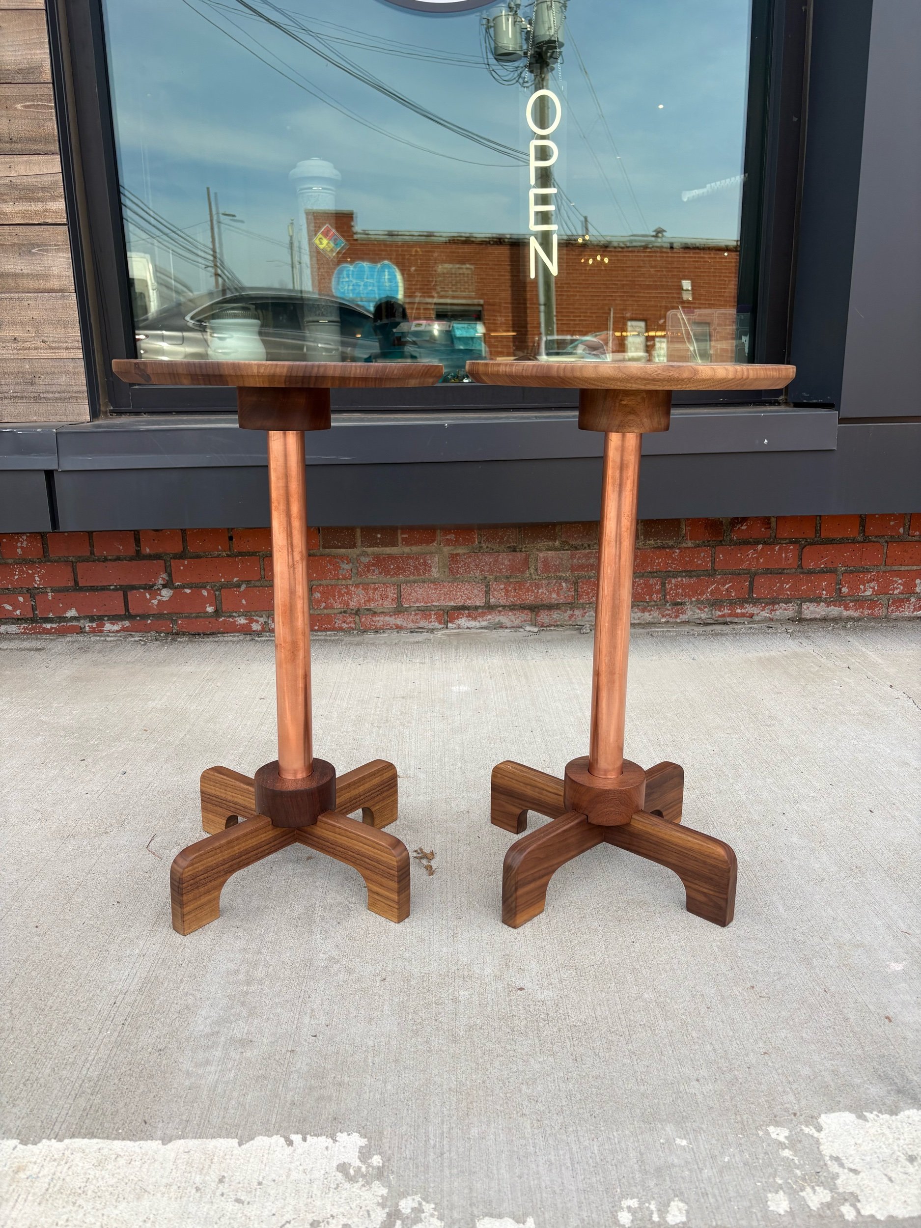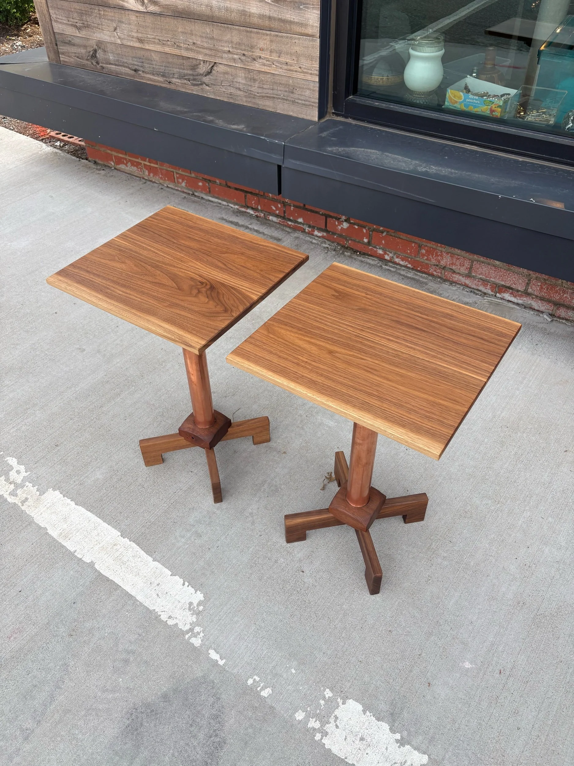 Designed, and hand crafted by local builder Alex Rivera. These beautiful tables are made of copper tubing and solid walnut. Structurally, they are incredibly sturdy. Strikingly beautiful grain with an oiled finish.