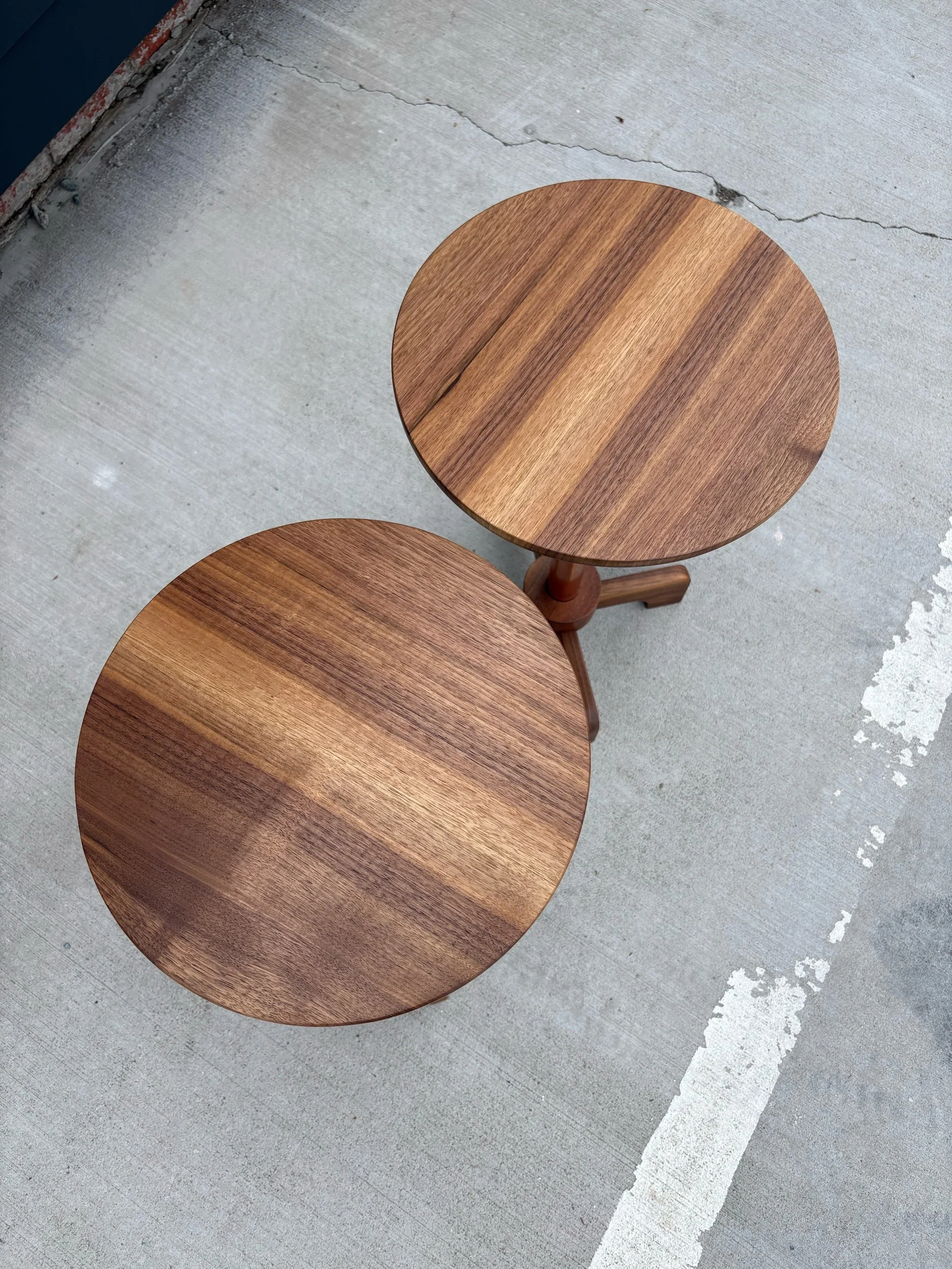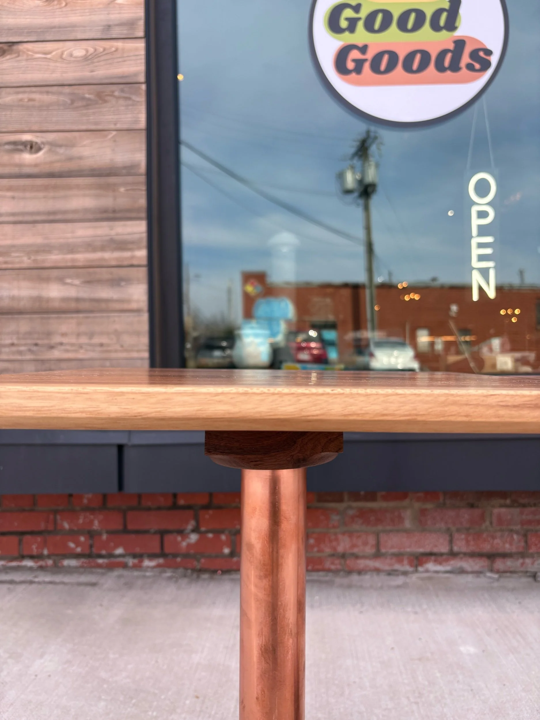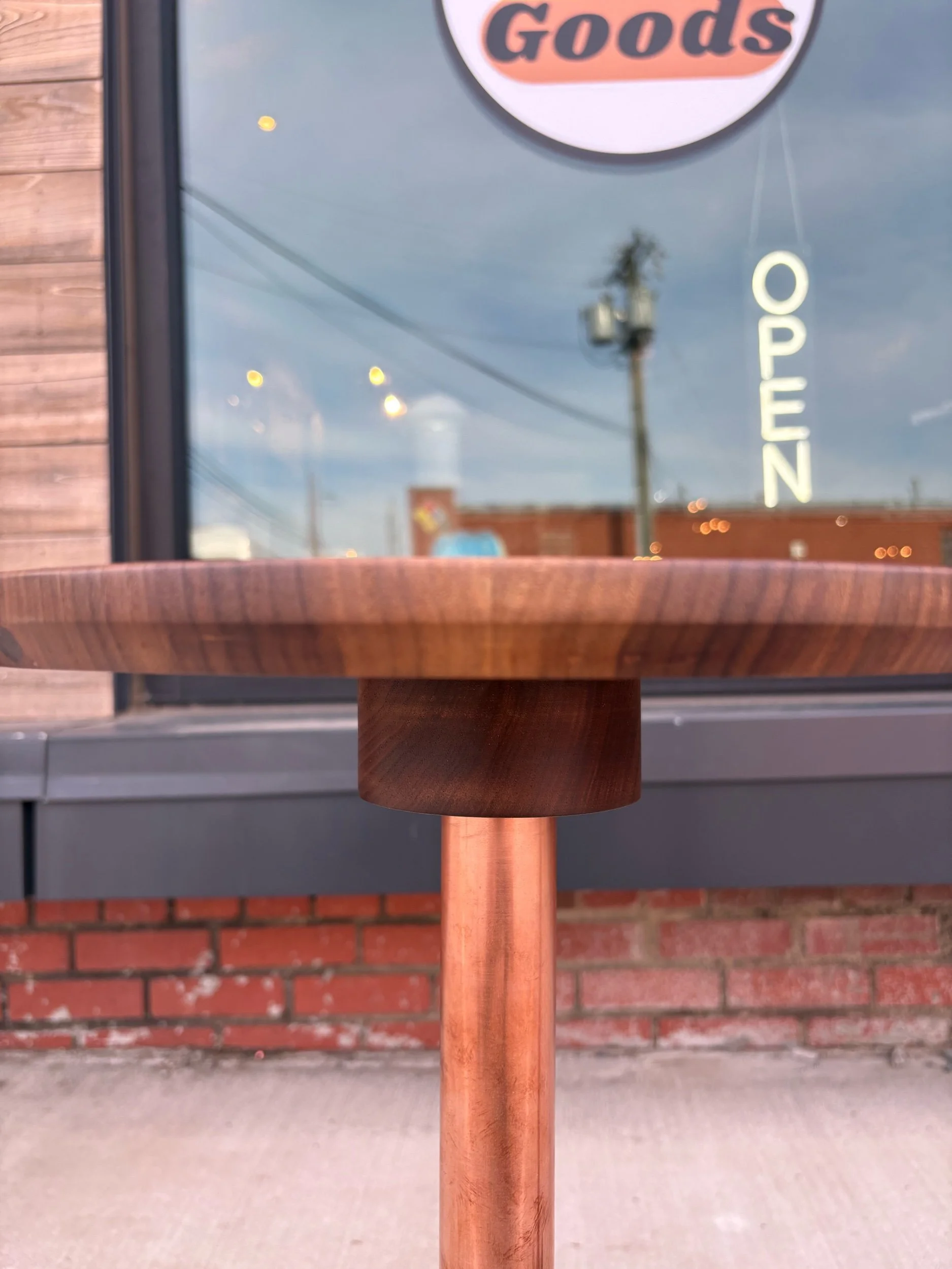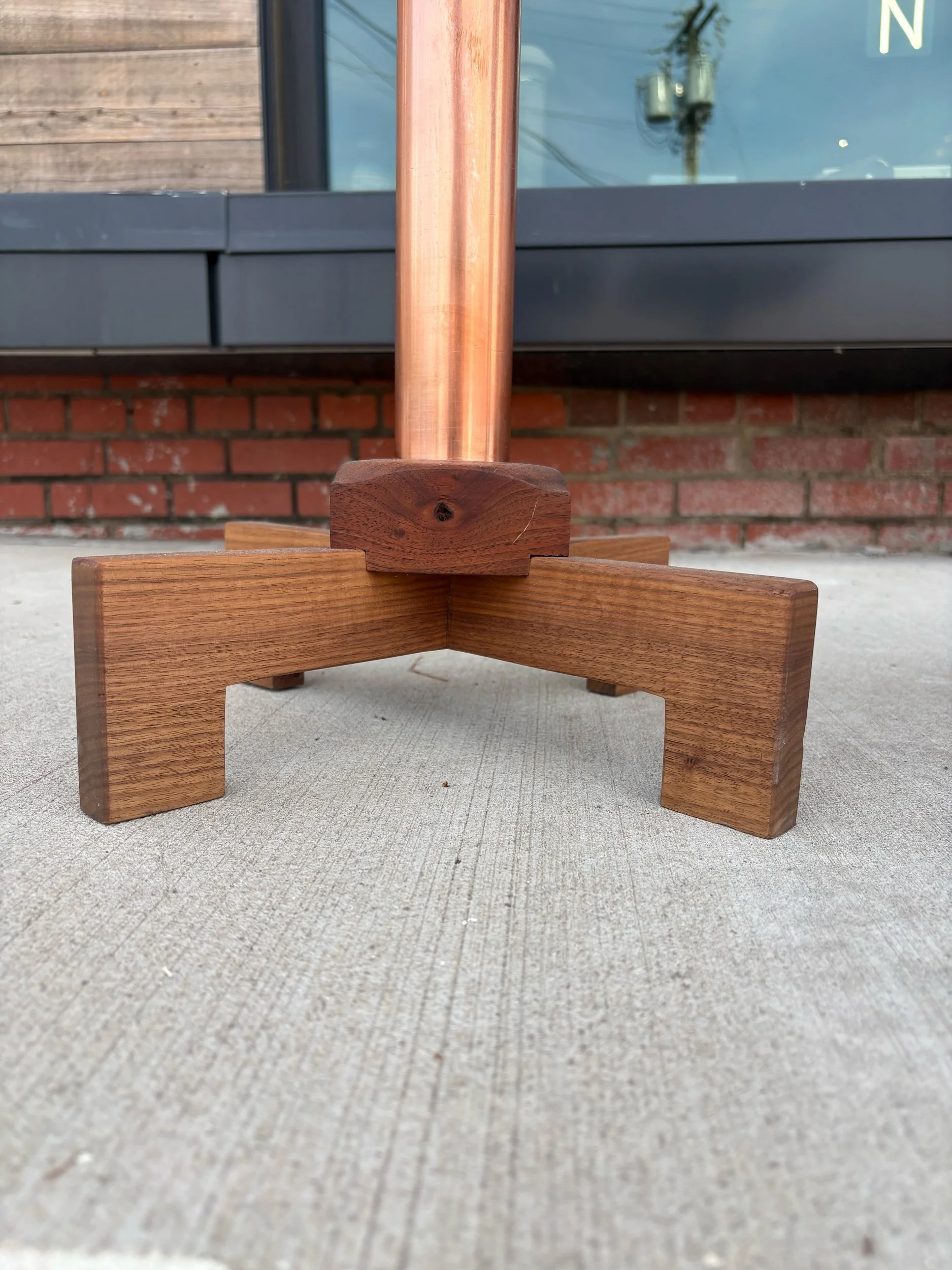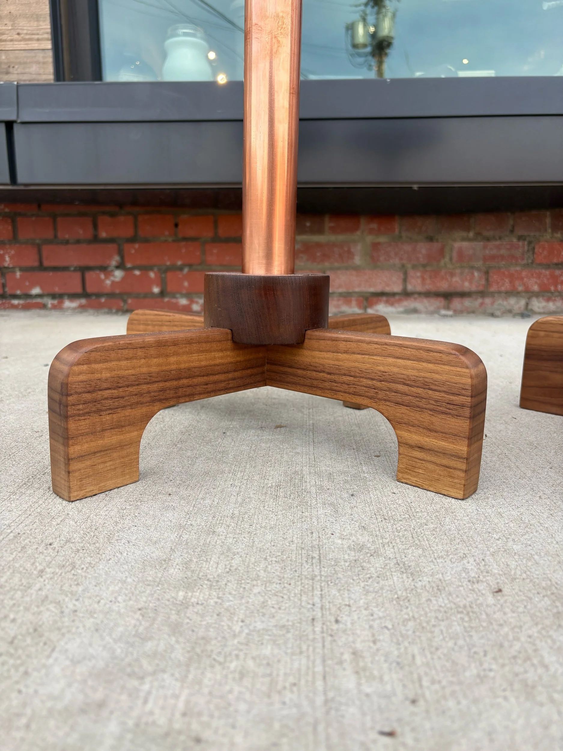 Designed, and hand crafted by local builder Alex Rivera. These beautiful tables are made of copper tubing and solid walnut. Structurally, they are incredibly sturdy. Strikingly beautiful grain with an oiled finish.