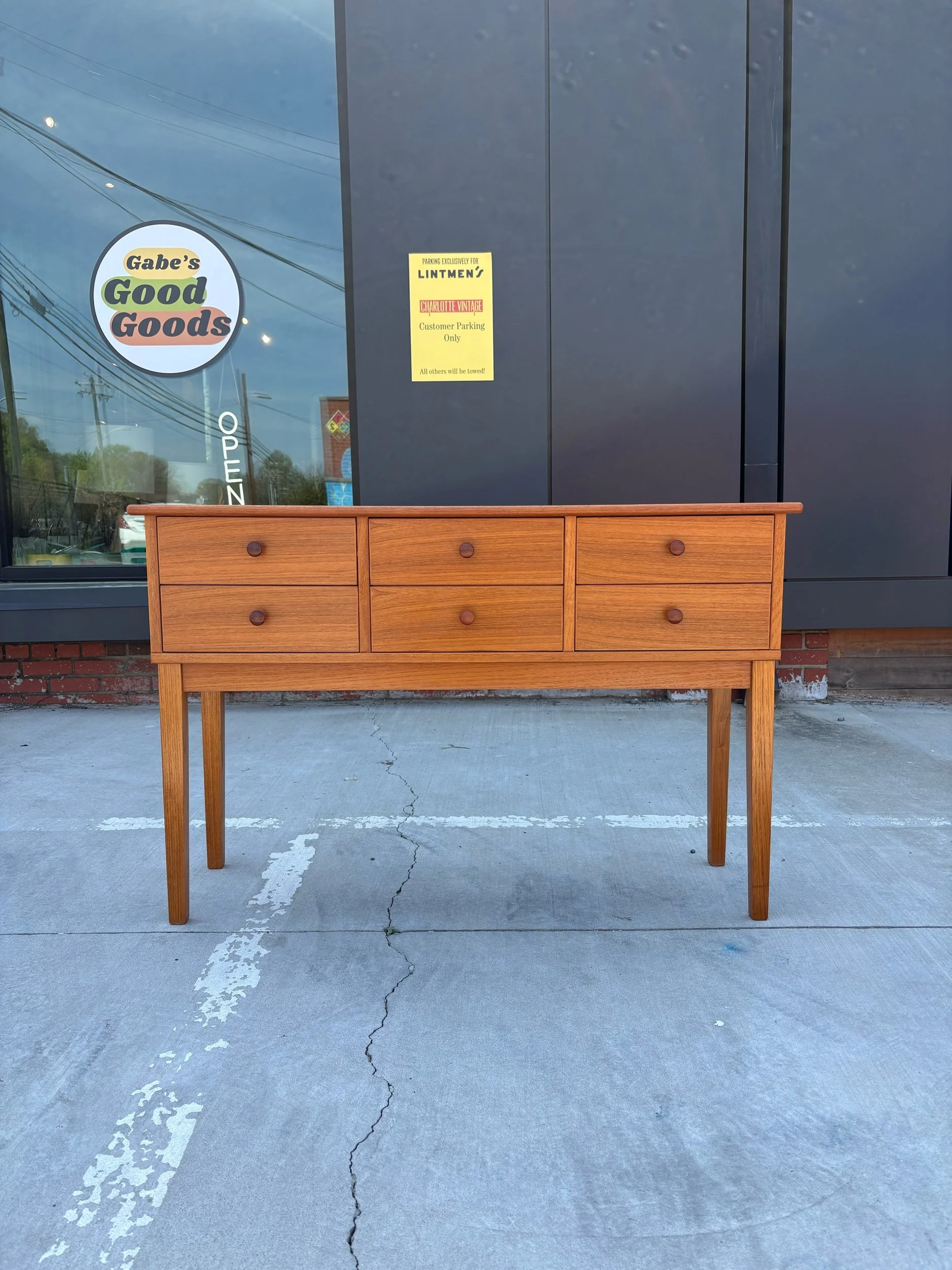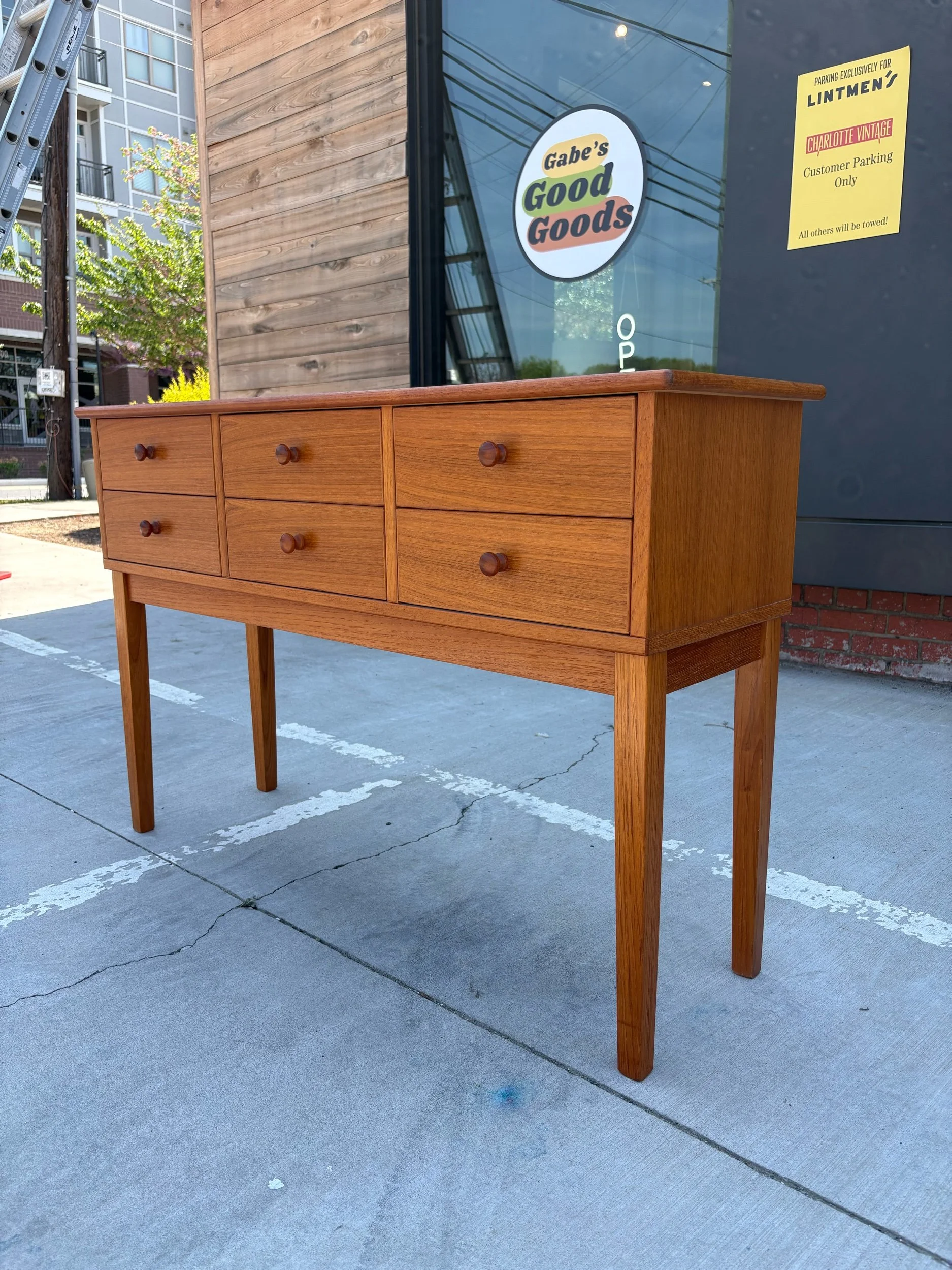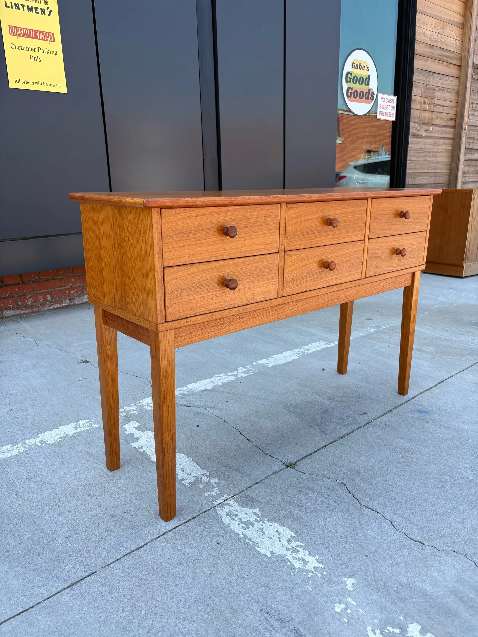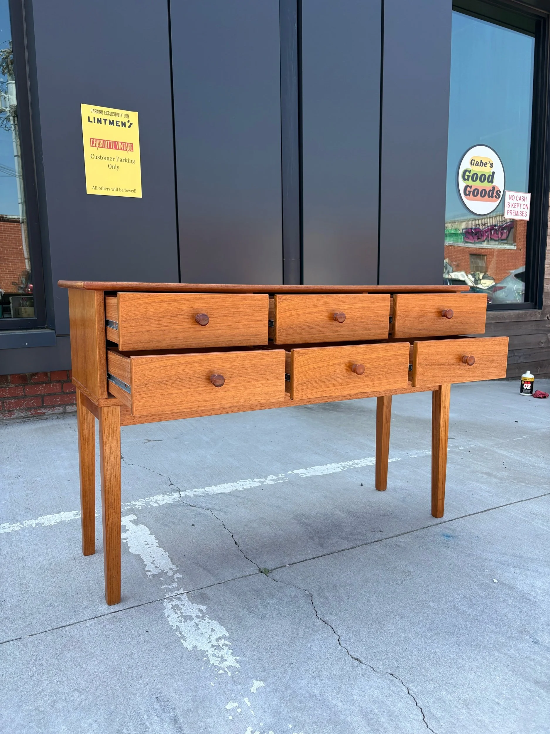Cute vintage Danish teak sofa/ console table with six drawers.
