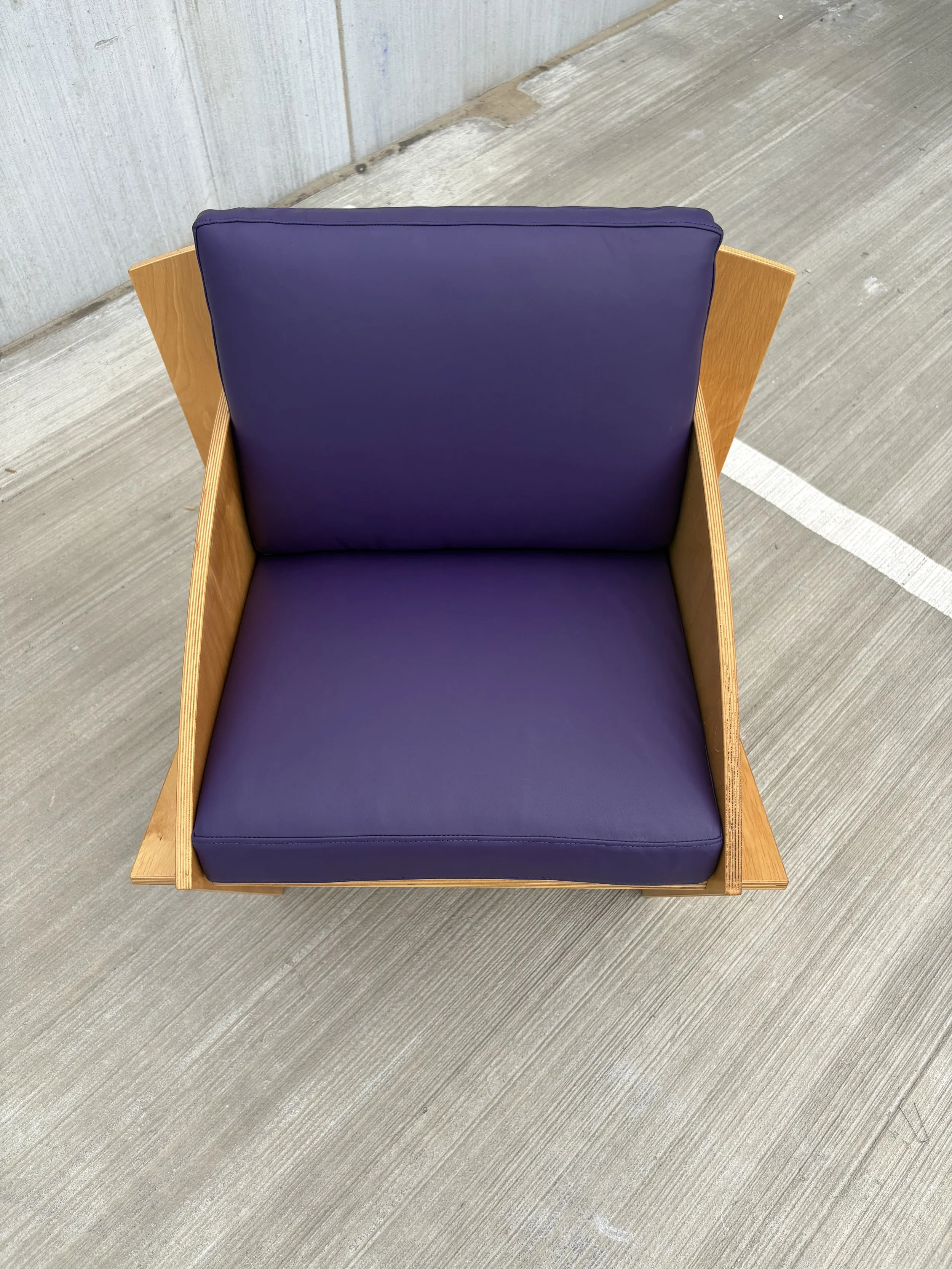 Finish has had a light refurbish. The original vinyl was rotting away, so it has been replaced with Gunnar Aagaard Andersen’s “Letters” fabric in Purple from Maharam Textiles/ Kravdrat. Maybe a bad use of a really nice fabric, but I had some small pieces of it that fit nicely where the cushions were.